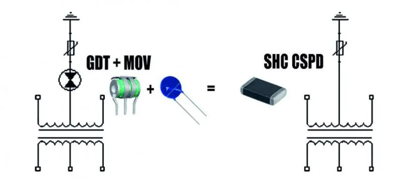 Im Vergleich mit bestehenden Schutzbauelementen mit gleichen Strom- und Energieanforderungen sind die CSPDs standardmäßig nicht bedrahtet, sondern für die Oberflächenmontage (SMT) konzipiert. Sie weisen zudem eine wesentlich kleinere Baugröße auf - dies spart zusätzliche Fertigungsschritte für die Bestückung bedrahteter Bauelemente und Platz auf der Platine. In einigen Fällen lassen sich sogar GDT- und MOV-Kombinationen durch ein einziges CSPD ersetzen (Bild 6). Hierdurch wird zusätzlicher Platz auf der Leiterplatte frei, und die Bestückungskosten sinken durch Einsparung von Bauelementen.