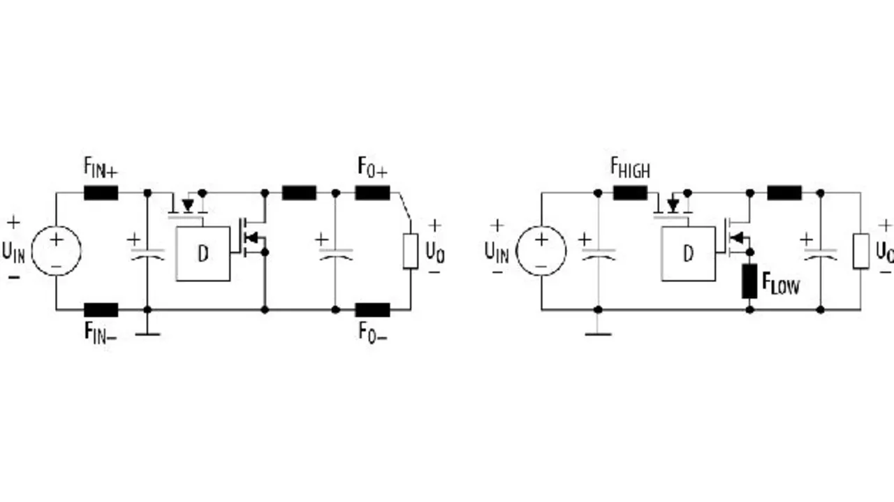 SMD-Ferrite hingegen sind wesentlich effektiver, wenn sie bei niedrigen Frequenzen (also bei 10 MHz und darunter) mit sehr niedrigen Impedanzwerten behaftet sind. Oberhalb dieser Frequenz bis hin zu 1 GHz und mehr kann die Impedanz, abhängig von Konzeption und Bauweise, allerdings sehr hoch ausfallen. Ferrite werden traditionell in Reihe mit den Eingangs- und Ausgangsverbindungen von Schaltwandlern angeordnet und können auch in Reihe mit dem Leistungsschalter platziert werden (Bild 1).