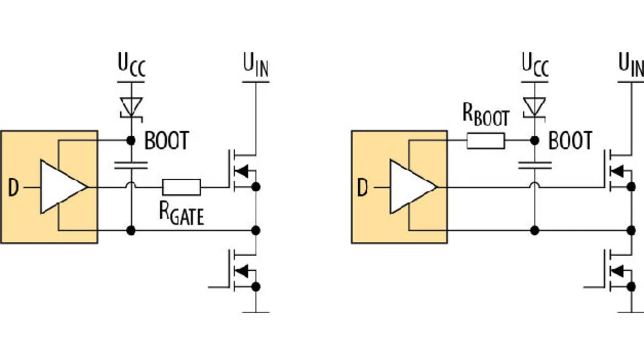 In Bild 2 werden zwei mögliche Positionen für ein Element zur Senkung der Änderungsgeschwindigkeit gezeigt: in Reihe mit dem Gate des High-Side-MOSFET oder in Reihe mit der Bootstrap-Schaltung. Dabei ist die Bootstrap-Anordnung aus drei Gründen zu bevorzugen: