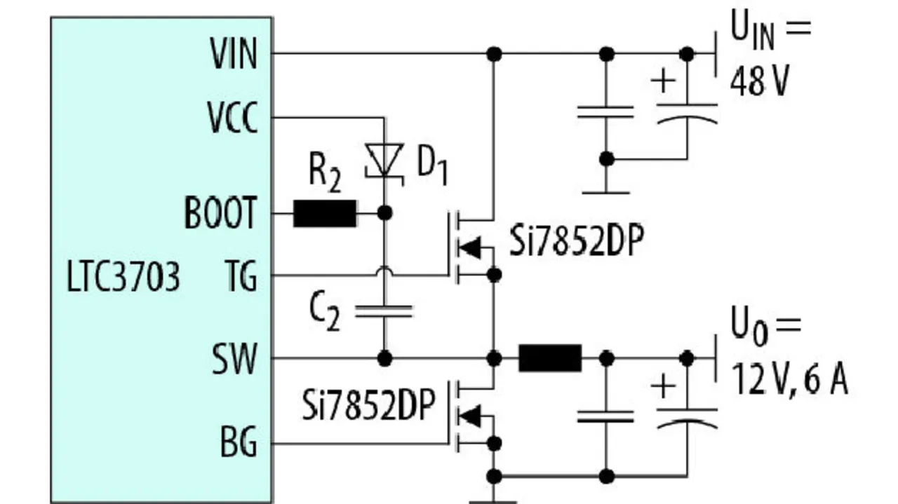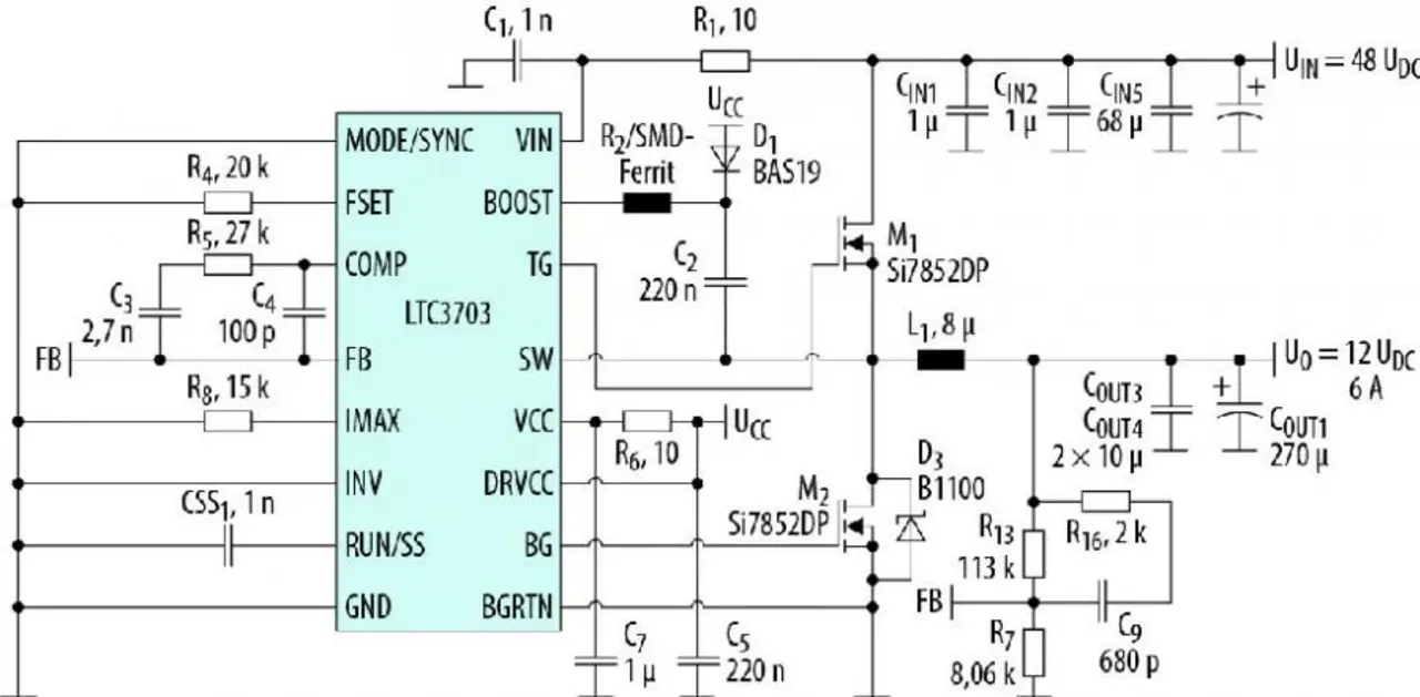 Die für die folgenden Messungen verwendete Beispielschaltung besteht aus dem Demo-Board DC501A in Verbindung mit dem synchronen Abwärtswandler LTC3703 von Linear Technology. Bild 3 zeigt ein vereinfachtes Schaltungsdiagramm, während das vollständige Schaltbild in Bild 4 enthalten ist.