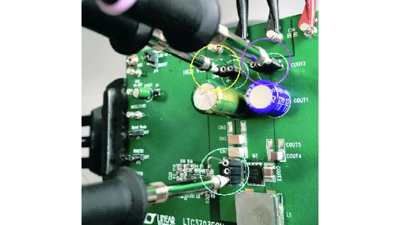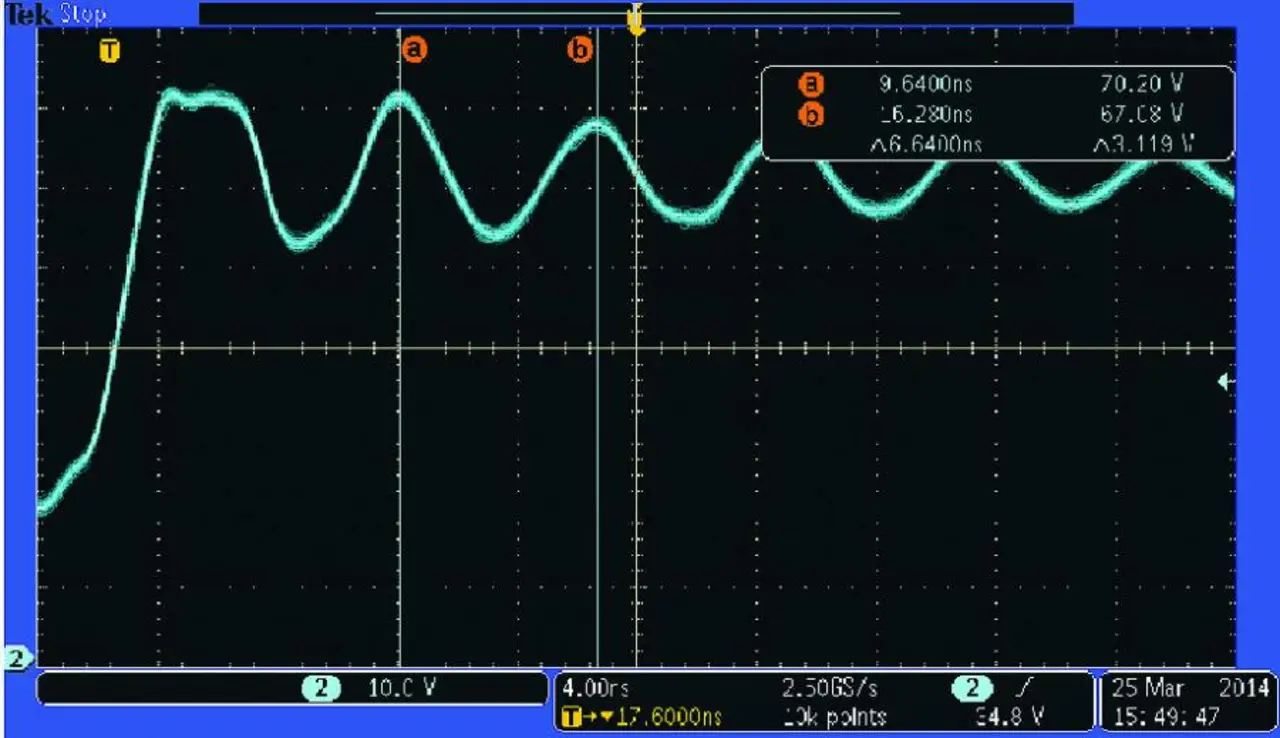 Zuerst richtet man – zunächst noch ohne Elemente zur Begrenzung der Änderungsgeschwindigkeit – den Wandler auf die typische Eingangsspannung und den maximalen Ausgangsstrom ein. Entsprechend den in Bild 3 angegebenen Werten sind dies 48 V für die Eingangsspannung, 12 V für die Ausgangsspannung und ein Ausgangsstrom von 6 A. Damit erfasst man die steigende Flanke des Schaltknotens. Dabei ist darauf zu achten, dass das Oszilloskop auf maximale Bandbreite eingestellt ist. Optimale Ergebnisse werden überdies mit einer als Zubehör erhältlichen Federspitze erzielt, die den meisten Spannungsfühlern für Oszilloskope beiliegt.
