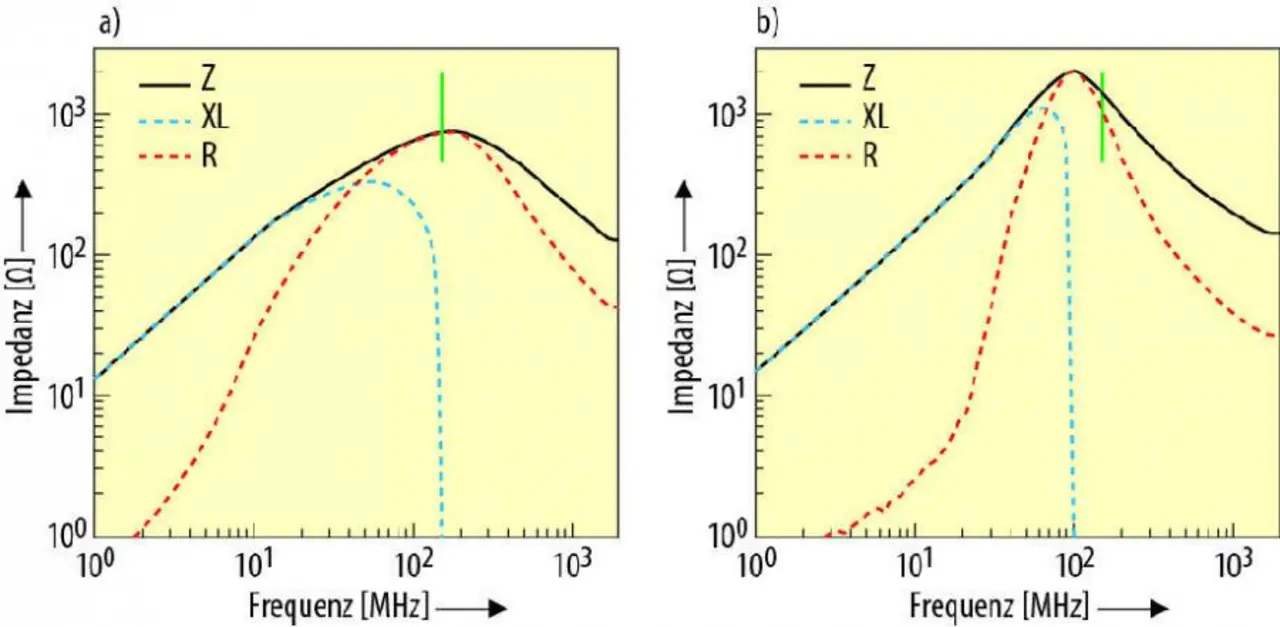 Bild 8 wiederum zeigt die typischen Kennlinien von Blindwiderstand, Widerstand und Impedanz für den 74279265 (600 Ω, linkes Bild) und den 742792693 (2200 Ω, rechtes Bild). Der Entwickler sollte hier in jedem Fall die Widerstandskennlinie (im Diagramm die resultierende schwarze Kurve) verwenden, da der Hochfrequenzstrom durch den RDC in Wärme umgewandelt wird.