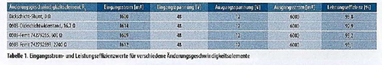 Tabelle 1 zeigt die relativen Eingangsströme und Leistungseffizienzwerte der Testschaltung ohne Regelung der Änderungsgeschwindigkeit, ferner mit einem abgestimmten Widerstand von 16,2 Ω für R2 und mit den beiden verwendeten Ferritkernspulen.