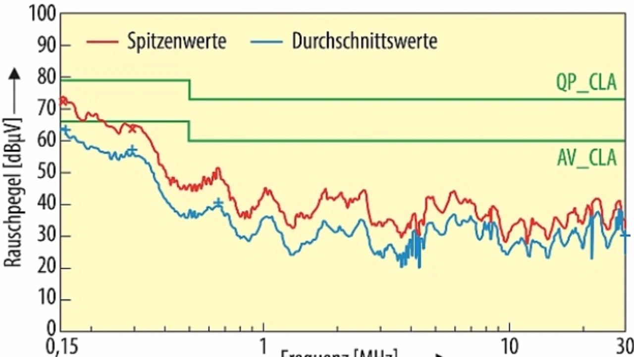 Bild 4 zeigt die Wirkungsweise der SineFormer-Technologie. Selbst bei gekreuzter Verlegung von Netzleitung und ungeschirmter Motorleitung werden die Grenzwerte sicher eingehalten (hier nach EN 55011, Klasse A Gruppe 1 beziehungsweise EN 61800-3 Kategorie C2). Dass so gut wie keine Kopplungen auftreten, zeigt eindeutig die sehr gute Wirkung dieser Filtertechnologie. In Summe lassen sich die Systemkosten senken und die Anlagenverfügbarkeit erhöhen.