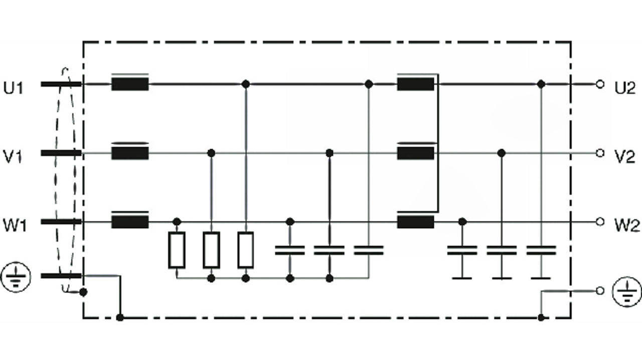 Motordrosseln und Sinusfilter reduzieren Spannungsspitzen auf den Motorleitungen, zeigen aber bei Störungen gegen Schutzleiter kaum Wirkung. Auch Motorlagerströme werden nur wenig bedämpft und es sind nach wie vor geschirmte Motorleitungen erforderlich. Um die asymmetrischen Störungen auf der Motorleitung soweit zu reduzieren, dass auf die Schirmung der Motorleitung verzichtet werden kann, muss ein EMV-Sinusfilter verwendet werden. Dieses besteht aus einem Sinusfilter, das durch eine stromkompensierte Drossel mit Kondensatoren gegen Masse ergänzt ist. Diese Schaltungstechnik kommt u.a. beim SineFormer von Epcos zum Einsatz (Bild 3).