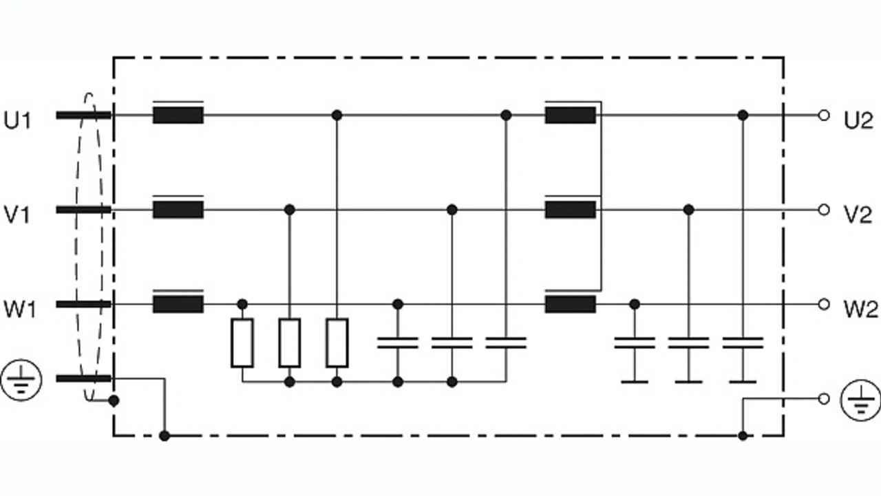 Motordrosseln und Sinusfilter reduzieren Spannungsspitzen auf den Motorleitungen, zeigen aber bei Störungen gegen Schutzleiter kaum Wirkung. Auch Motorlagerströme werden nur wenig bedämpft und es sind nach wie vor geschirmte Motorleitungen erforderlich. Um die asymmetrischen Störungen auf der Motorleitung soweit zu reduzieren, dass auf die Schirmung der Motorleitung verzichtet werden kann, muss ein EMV-Sinusfilter verwendet werden. Dieses besteht aus einem Sinusfilter, das durch eine stromkompensierte Drossel mit Kondensatoren gegen Masse ergänzt ist. Diese Schaltungstechnik kommt u.a. beim SineFormer von Epcos zum Einsatz (Bild 3).