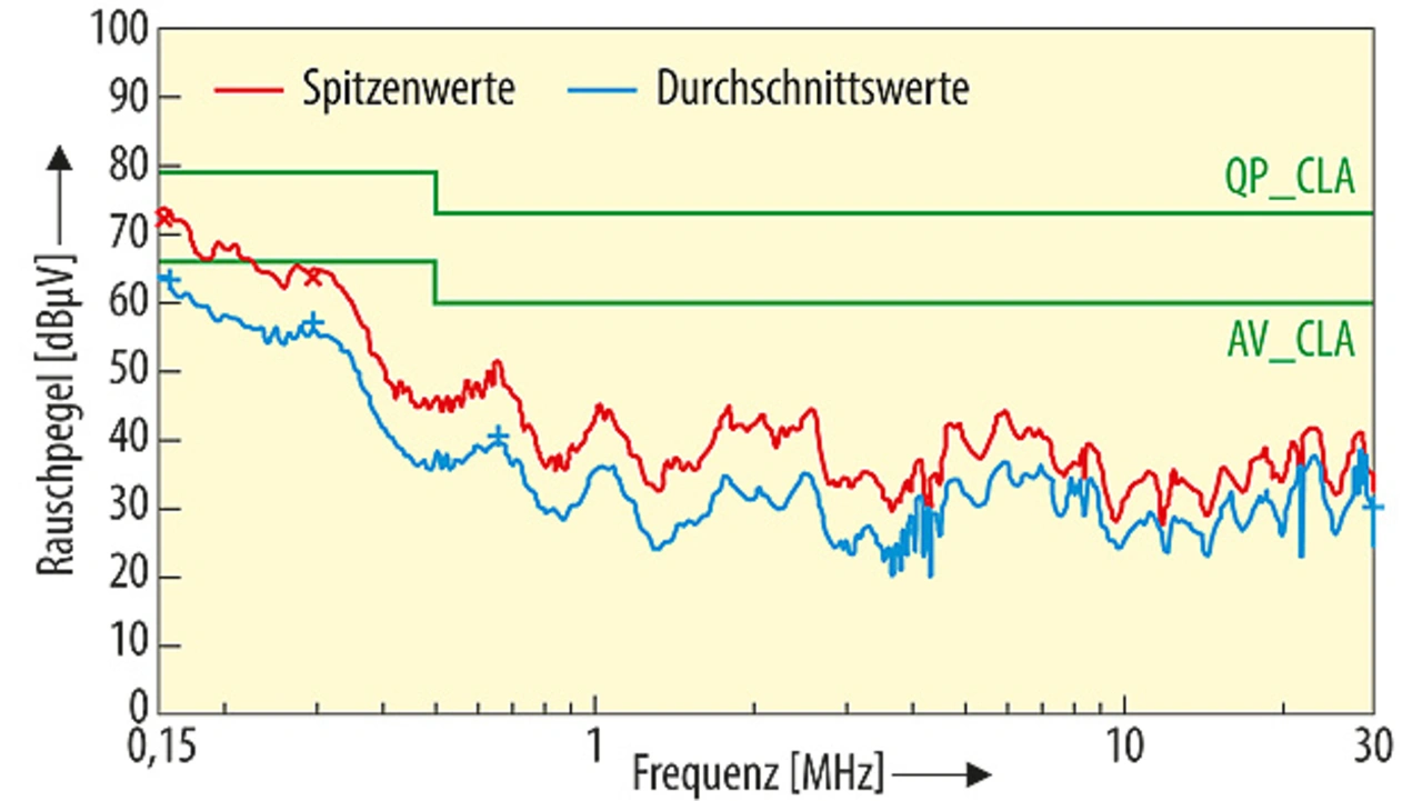 Bild 4 zeigt die Wirkungsweise der SineFormer-Technologie. Selbst bei gekreuzter Verlegung von Netzleitung und ungeschirmter Motorleitung werden die Grenzwerte sicher eingehalten (hier nach EN 55011, Klasse A Gruppe 1 beziehungsweise EN 61800-3 Kategorie C2). Dass so gut wie keine Kopplungen auftreten, zeigt eindeutig die sehr gute Wirkung dieser Filtertechnologie. In Summe lassen sich die Systemkosten senken und die Anlagenverfügbarkeit erhöhen.