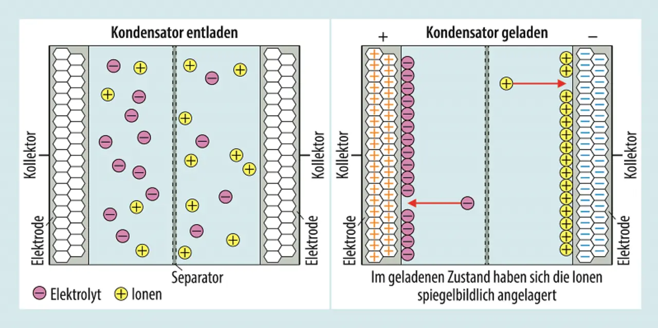 In heutigen EDLCs wird diese Ladungsspeicherung optimal ausgenutzt. Die konstruktive Basis der Kondensatoren besteht aus zwei Aktivkohle-Elektroden, welche auf einer Aluminiumfolie, dem Kollektor, aufgebracht wurden. Die Elektroden sind gegen Kurzschluss voneinander durch eine Membran – dem sogenannten Separator – getrennt, welche durchlässig für Ionen ist. Gleichzeitig dient sie als Speicher für den flüssigen Elektrolyten. Der flüssige Elektrolyt liefert Ionen als Träger der elektrischen Stromleitung im Kondensator. Wird eine Spannung angelegt, wandern die Ionen im Elektrolyten zur jeweils gegenpoligen Elektrode. Die Ionen sammeln sich an der Phasengrenze (Grenze zwischen flüssigem Elektrolyten und fester Elektrode) und bilden eine Doppelschicht (Bild 1).