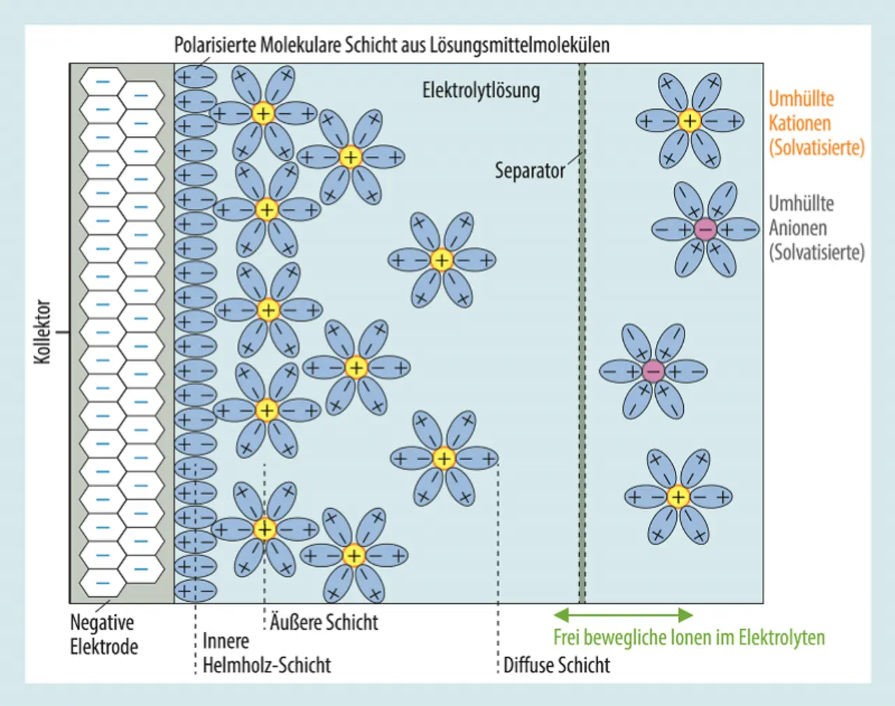 Die Doppelschicht besteht aus den Ionen im Elektrolyten und einer Schicht aus Gegenionen in der Elektrode. Zwischen den beiden Ladungsträgern bildet sich ein elektrisches Feld aus, welches die Molekülschicht dazwischen polarisiert und voneinander isoliert. Sie weist eine „ladungstrennende Wirkung“ auf und trennt die beiden Schichten wie das Dielektrikum eines Plattenkondensators. Diese Schicht wird auch „Innere Helmholtz-Schicht“ genannt. Zusammen mit der Ionenschicht im Elektrolyten („Äußere Helmholtz-Schicht“) werden diese Schichten Doppelschicht genannt (Bild 2). Vereinfacht ausgedrückt entstehen zwei Platten, die von einem Dielektrikum getrennt werden. Das Ausbilden der Doppelschicht geschieht sehr schnell, da die Ionen nur adsorbiert werden und keine chemische Bindung eingehen. Das ermöglicht ein besonders schnelles Auf- und Abbauen der Doppelschicht beziehungsweise Laden und Entladen des Kondensators.