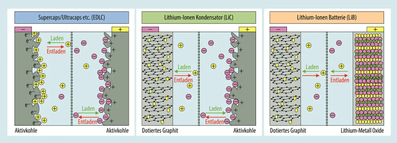 Lithium-Ionen-Kondensatoren vereinen die Vorzüge von EDLC und Batterien: die hohe Leistungsdichte der EDLC vereint mit der hohen Energiedichte von Batterien. Die Konstruktion eines Lithium-Ionen-Kondensators ähnelt dem eines EDLC. Eine der eingesetzten Aktivkohle-Elektroden ist baugleich wie beim Doppelschichtkondensator. Die zweite Elektrode wurde gegen eine stark pseudokapazitive Elektrode ausgetauscht, welche aus einem mit Lithium-Ionen dotierten Graphit besteht. (Bild 3)