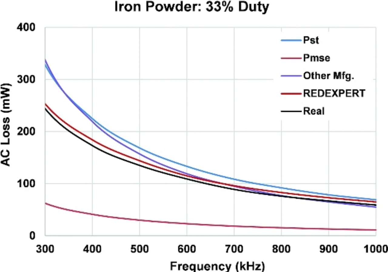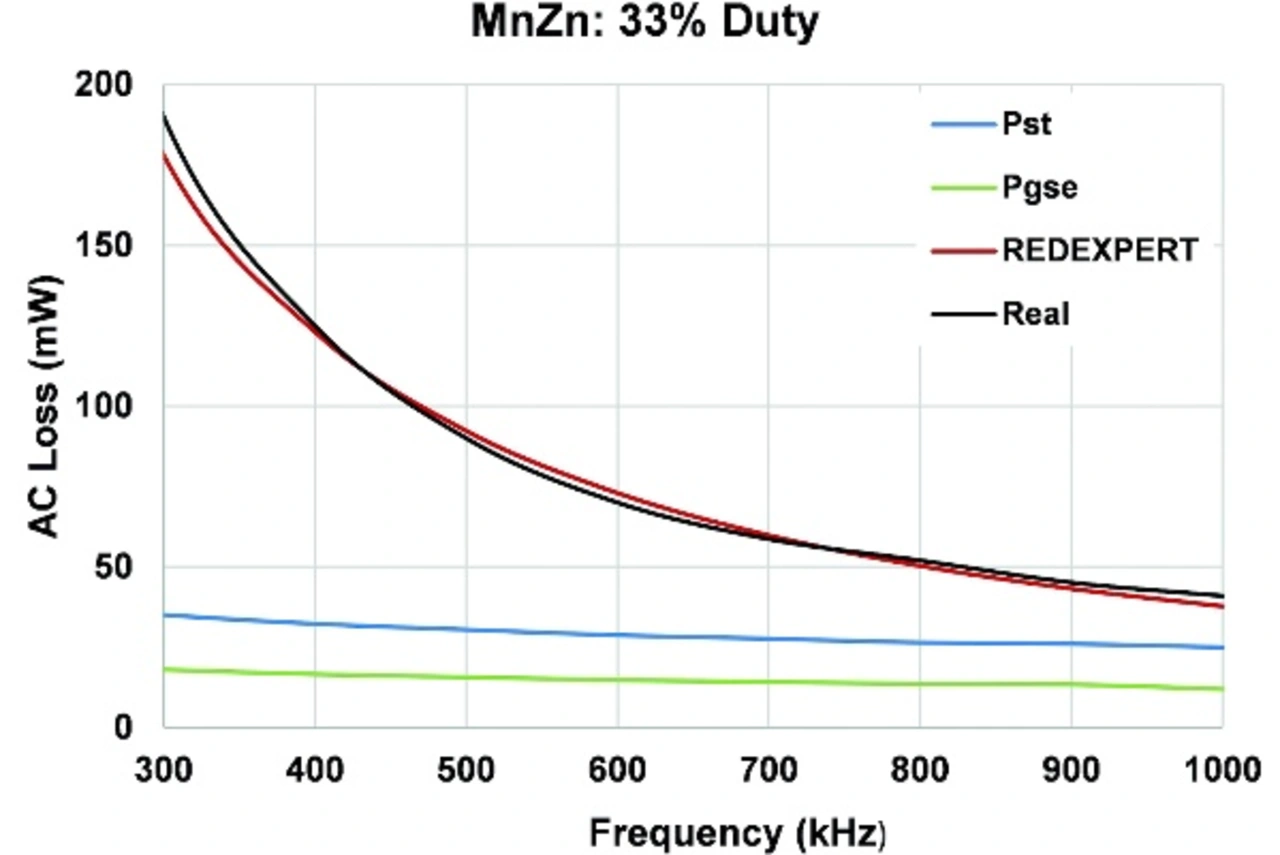 Würth Elektronik hat das im eigenen Haus entwickelte Modell ausgiebig validiert und mit bestehenden Modellen und gemessenen Daten verglichen. Wechselstromverluste für verschiedene Materialien wie WE-Superflux, Eisenpulver, NiZn, MnZn wurden über große Tastverhältnis- und Frequenzbereiche gemessen und mit theoretischen Modellen verglichen, wie Bild 5 zeigt. In den Diagrammen sind die mit der Steinmetz-Leistungsgleichung (Pst), der modifizierten Steinmetz-Gleichung (Pmse) und der generalisierten Steinmetz-Gleichung (Pgse) ermittelten Kernverluste dargestellt. „RedExpert“ ist der Wechselstromverlust nach Berechnung mit dem AC-Verlustmodell von Würth Elektronik. „Real“ ist der gemessene AC-Verlust.