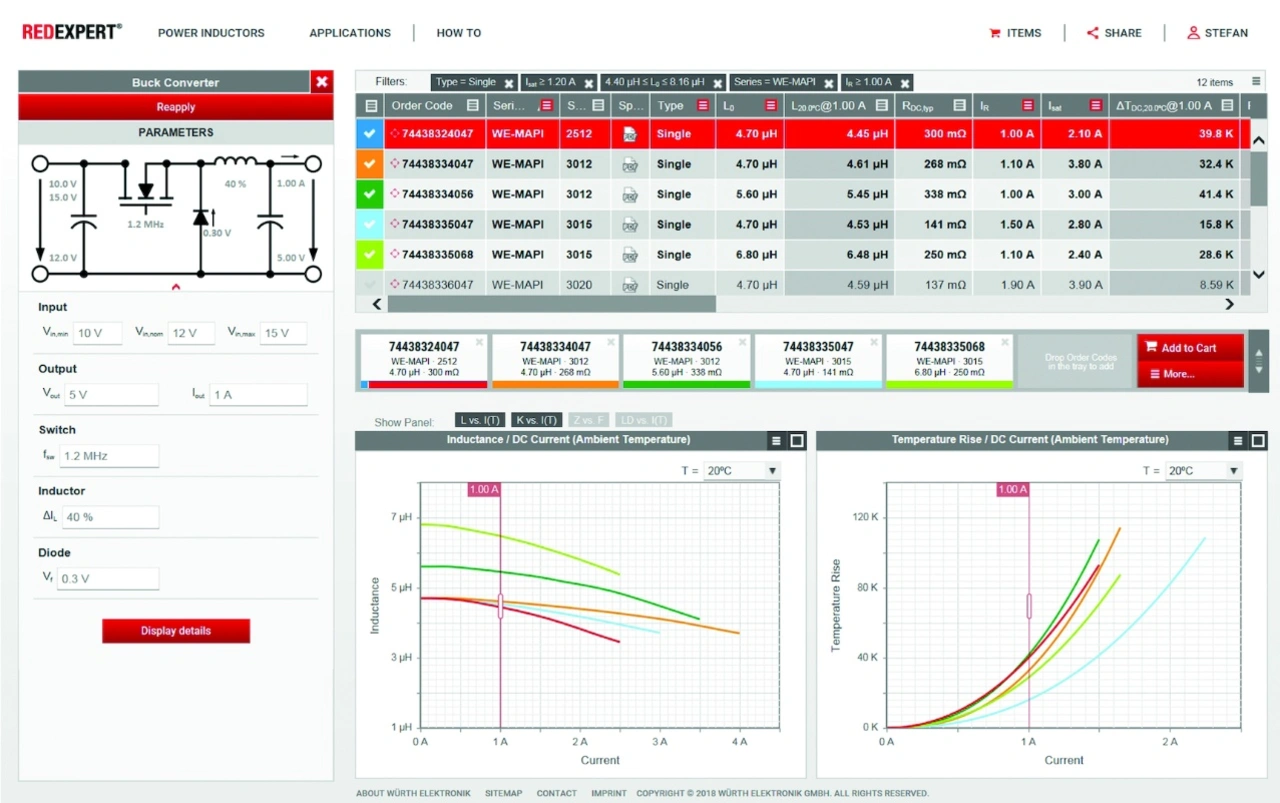 RedExpert ist das Online-Designwerkzeug von Würth Elektronik eiSos, mit dem unkompliziert eine für die jeweilige Anwendung geeignete Speicherdrossel ausgewählt werden kann. Es ist ein einfach zu bedienendes und effektives Tool, um in kürzester Zeit Bauteile vergleichen und auswählen zu können.