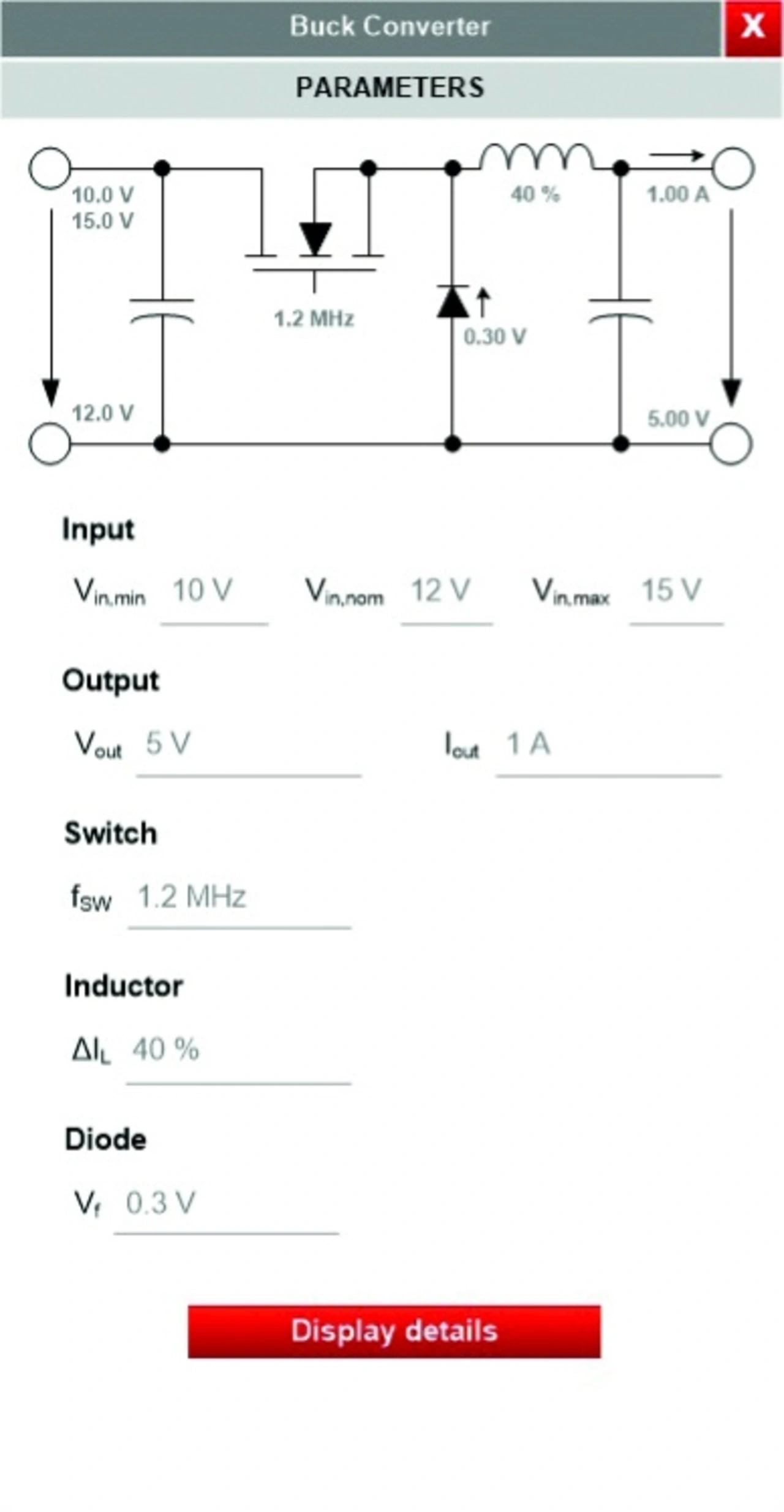 Um die richtige Induktivität für einen Tiefsetzsteller zu ermitteln, gibt man in der Eingabemaske (Bild 7) den vorhandenen Eingangsspannungsbereich sowie Ausgangsspannung und -strom ein, dazu noch die Schaltfrequenz, die Diodenflussspannung und den angestrebten Ripple-Strom der Induktivität. Mit einem Klick auf „Details anzeigen“ erhält man die passenden Speicherinduktivitäten sowie deren erwartete Ripple-Ströme und die Verluste in der Applikation.