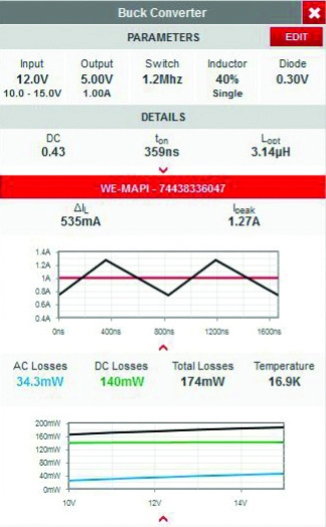 Die Berechnung der AC-Verluste in einem magnetischen Bauteil ist ebenso kritisch wie komplex, doch da in RedExpert das AC-Verlustmodell von Würth Elektronik integriert ist, gestaltet sich die Aufgabe einfacher. Aufgrund der genauen Berechnung der kompletten AC-Verluste eignet sich die Anwendung auch zur Temperaturabschätzung.