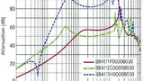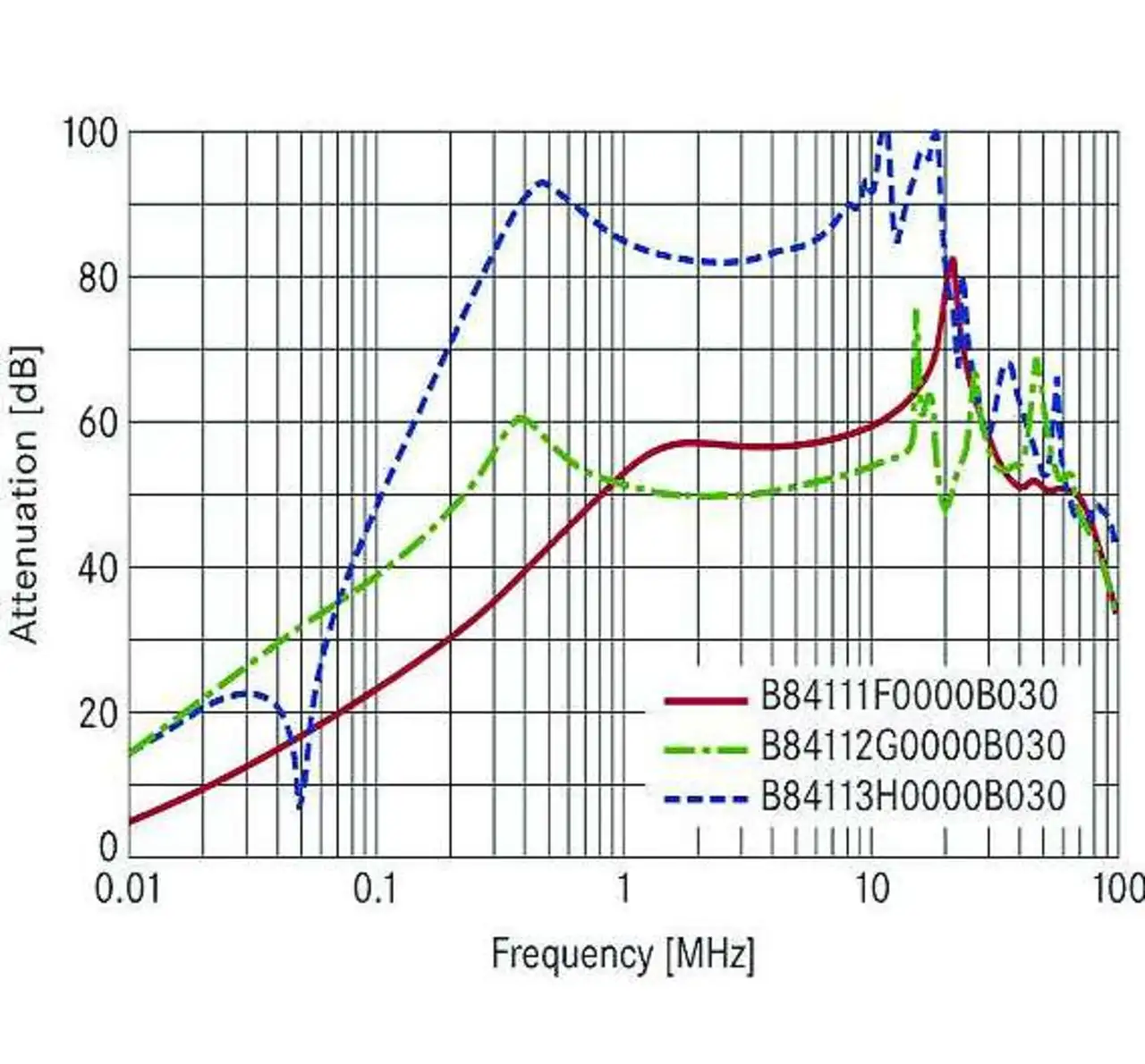 In Bild 2 ist die asymmetrische Einfügungsdämpfung (Common Mode) der 3-Aversionen von SIFI-F (B84111FB30), SIFI-G (B84112GB30) und SIFI-H (B84113HB30) in Abhängigkeit von der Frequenz dargestellt.
