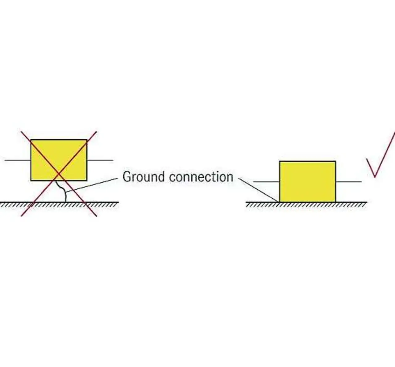 Beim Einbau des Filters sollte das Gehäuse möglichst großflächig mit der Masse (Oberfläche ohne Lackschicht) der anderen Baugruppen verbunden werden. Dies ist besonders bei Störfrequenzen von über 1 MHz zu beachten. Bei solch hohen Frequenzen ist der Masse-Anschluss per Kabellitze unbedingt zu vermeiden (siehe Abbildung).