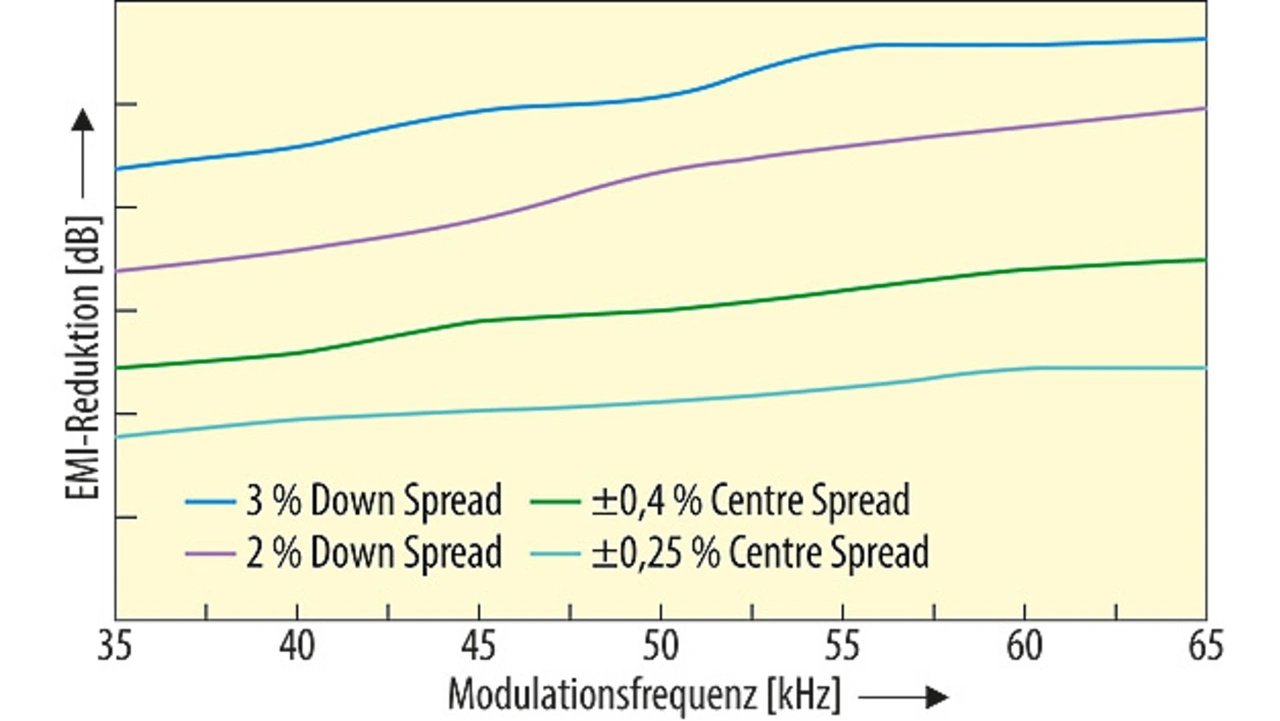 Die Modulation auf die Nominalfrequenz des Oszillators gilt im gleichen Umfang auch für die Harmonischen dieses Taktes. Ist die Nominalfrequenz 100 MHz, so beträgt die 3. Harmonische 300 MHz und die 5. Harmonische 500 MHz. Der einprozentige Spread bei den Grundfrequenzen gilt auch für die 3. und 5. Harmonischen. Die Auswirkung der Modulation auf die EMI-Reduktion ist bei den höheren Harmonischen größer als bei der Grundfrequenz. Dies liegt daran, dass die einprozentige Spread bei 100 MHz nun mal 1 MHz beträgt, aber schon 3 MHz bei der 3. Harmonischen.
