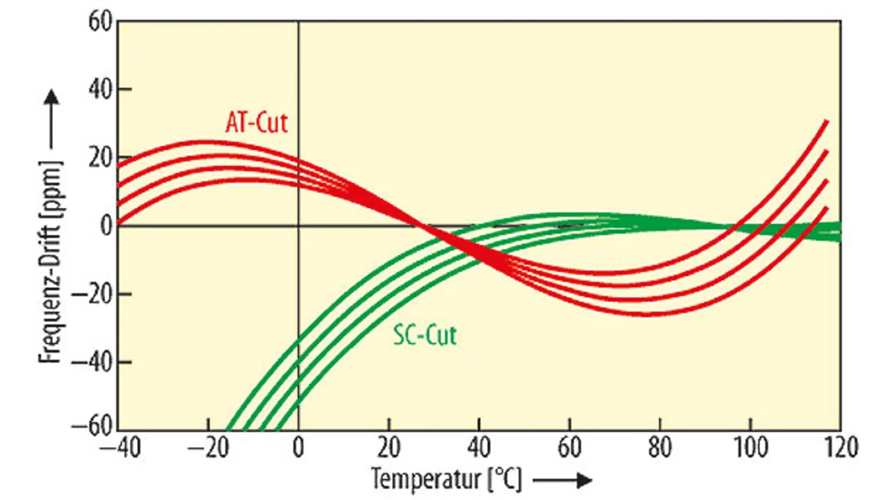 Darüber hinaus wird in dieser Abbildung gezeigt, dass sich der SC-Cut durch einen flacheren Umkehrpunkt bei höherer Temperatur auszeichnet. Er eignet sich daher für Anwendungen, in denen eine höhere Betriebstemperatur erforderlich ist. Der Nachteil von Quarzen im SC-Schnitt liegt darin, dass die Herstellung wesentlich schwieriger und die erwartete Ausbeute geringer ist als bei AT-Schnitt-Quarzen. Zwangsläufig liegen die Kosten deutlich höher.