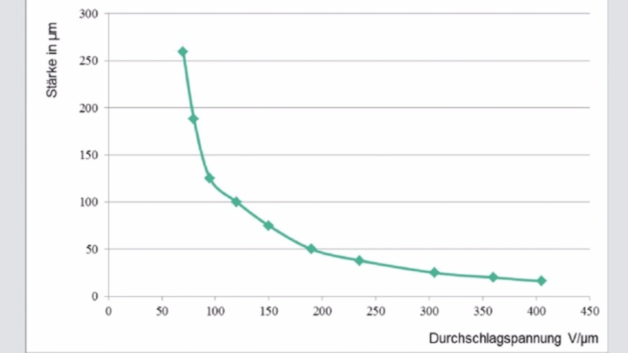 Die Durchschlagsspannung für Elektroisolierstoffe wird in vielen Datenblättern auf eine Arbeitsfrequenz von 50/60 Hz sinusförmigen Strom angegeben (IEC 60243, Elektrische Durchschlagfestigkeit von isolierenden Werkstoffen). Wie im Diagramm dargestellt, sinkt jedoch bei vielen Standardisolationsfolien bei höheren Frequenzen die Durchbruchspannungssfestigkeit deutlich. Hinweis: Die normierte Durchschlagsspannung wächst bei zunehmender Materialstärke nicht proportional mit. Vielmehr steigt die Durchbruchspannung durch die Verluste innerhalb des Materials bei größerer Materialstärke signifikant geringer (Bild 8).