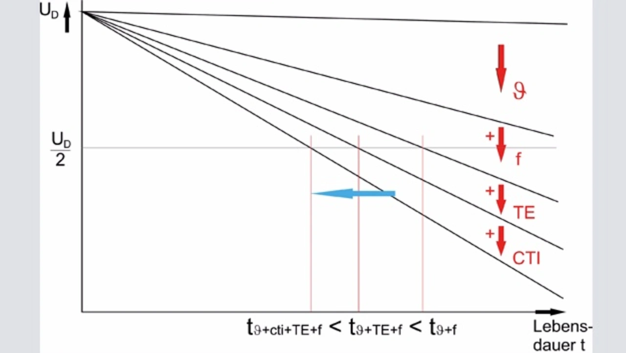 Die Datenblattangaben von Isolierstoffen spiegeln den optimalen Wert der Isolationsfähigkeit unter standardisierten Bedingungen (50/60 Hz Sinusspannung) am Anfang der Einsatzzeit wieder. Um ein elektrisches Gerät sicher auszulegen, ist es also notwendig, alle auftretenden Einflussgrößen (Temperatur, Spannung (Höhe und Frequenz), Verschmutzungen, Feuchtigkeit, chemische Belastungen, Hydrolyse und mechanischer Druck) in ihrer Wirkung aufzusummieren (Bild 11). Bei diesen Überlegungen lohnt es sich, die erforderliche Spannungsfestigkeit am Ende der erwarteten Lebensdauer zu kennen. Denn sie bestimmt wesentlich mit, welche Materialien mit welchen Anfangseigenschaften zu verwenden sind.