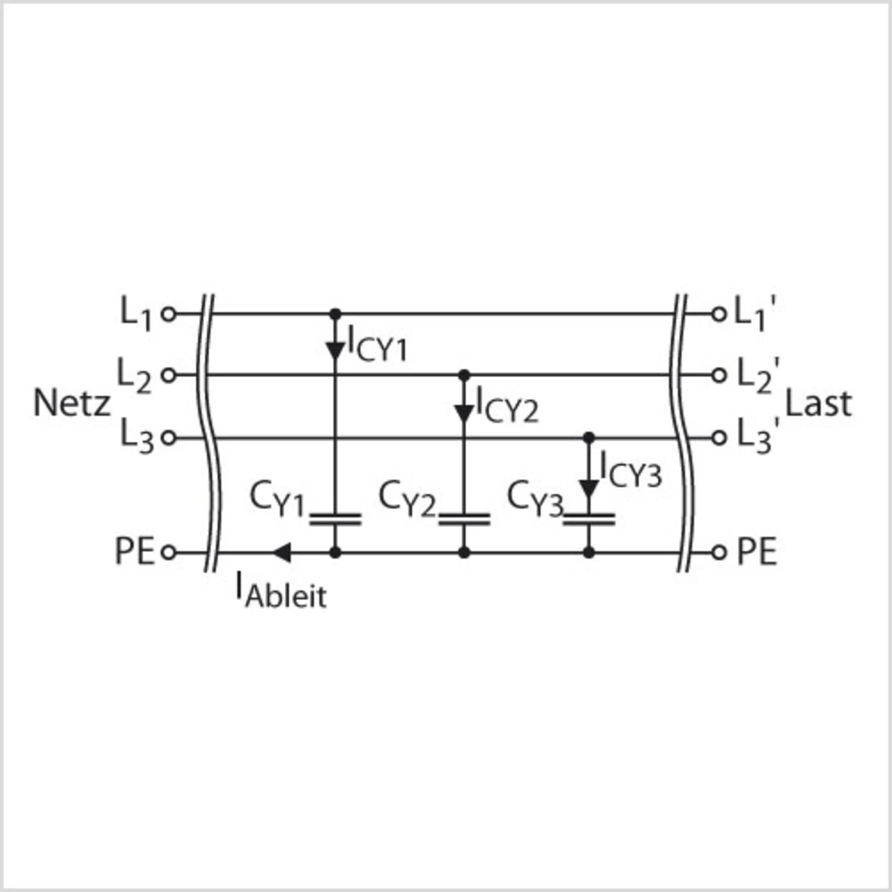 Ein idealer 3-Phasen-Filter hätte unter der Voraussetzung einer symmetrischen Belastung keine Ableitströme – auch bei großen asymmetrischen Störungen.