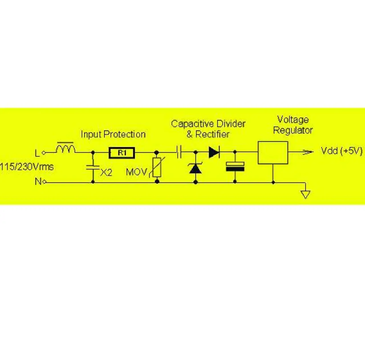 Bild 1 zeigt einen Teil einer typischen kostengünstigen transformatorlosen Stromversorgung für einen Elektrizitätszähler. Vor der Spannungsregelung wird die Netzspannung durch einen kapazitiven Spannungsteiler heruntergeteilt und gleichgerichtet.