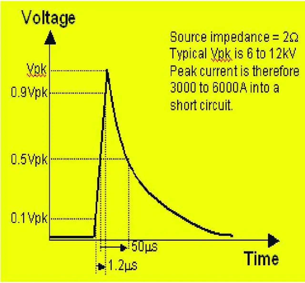 Bild 2 zeigt den Impuls, der zum Testen der Unempfindlichkeit gegen Blitzschläge gemäß IEC 61000-4-5 verwendet wird.