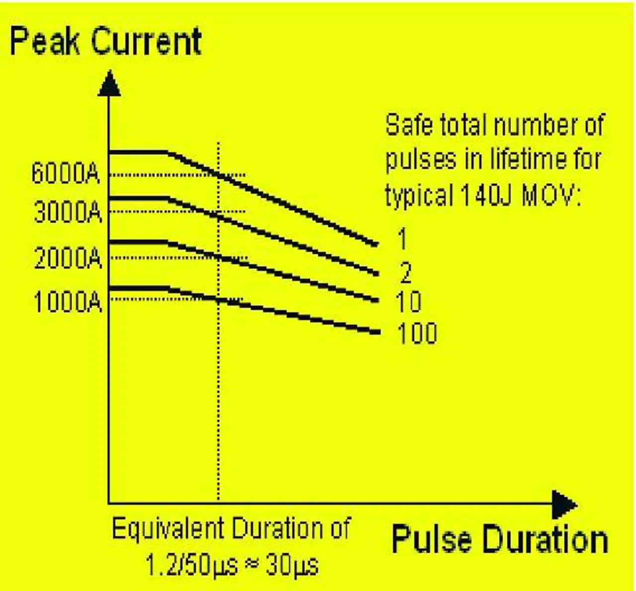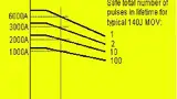Wird eine sichere Anzahl von Impulsen während der Produktlebensdauer überschritten (siehe Bild 3), so beginnt die MOV-Spannung zu steigen und fällt dann steil ab, bis ein Kurzschluss erreicht ist.
