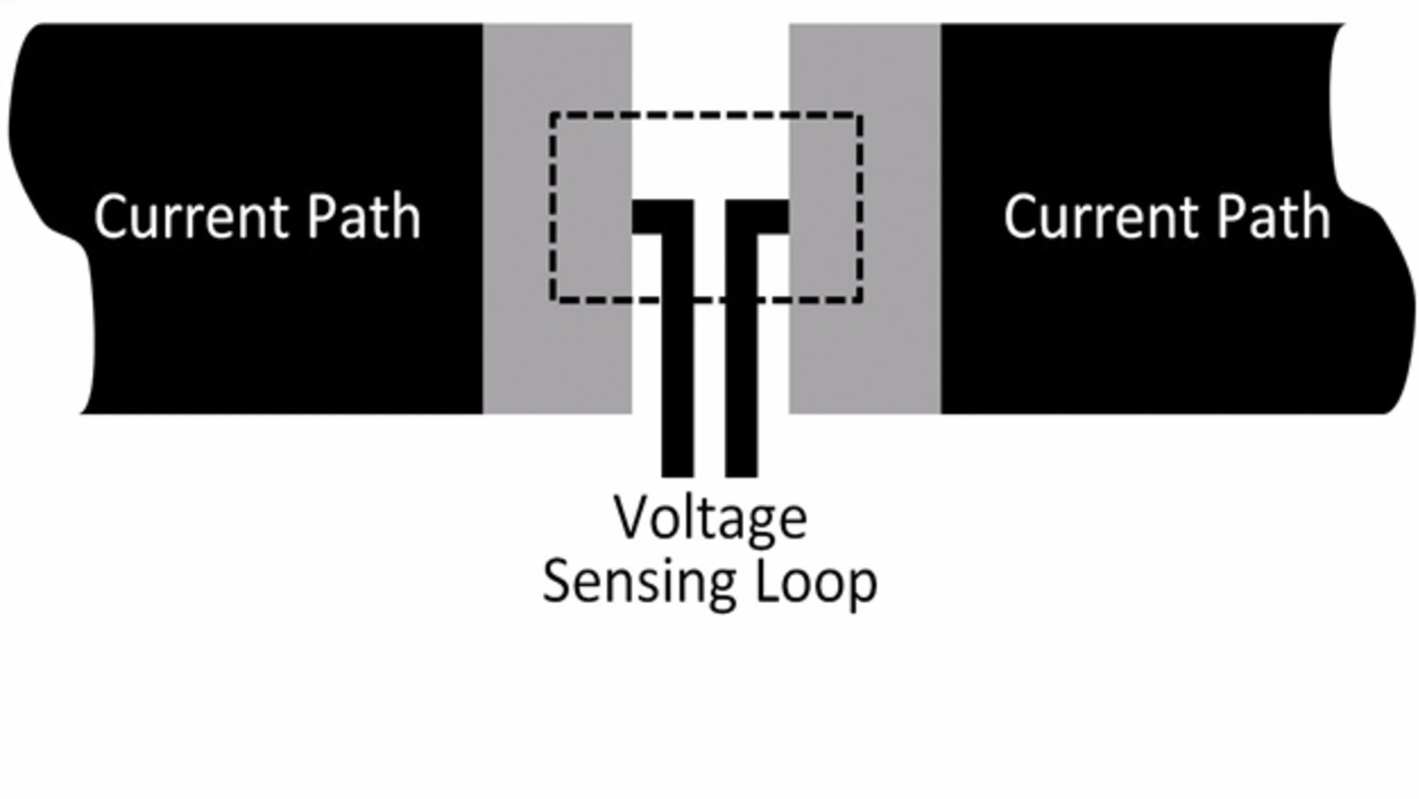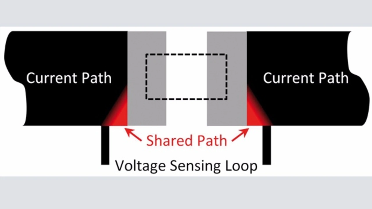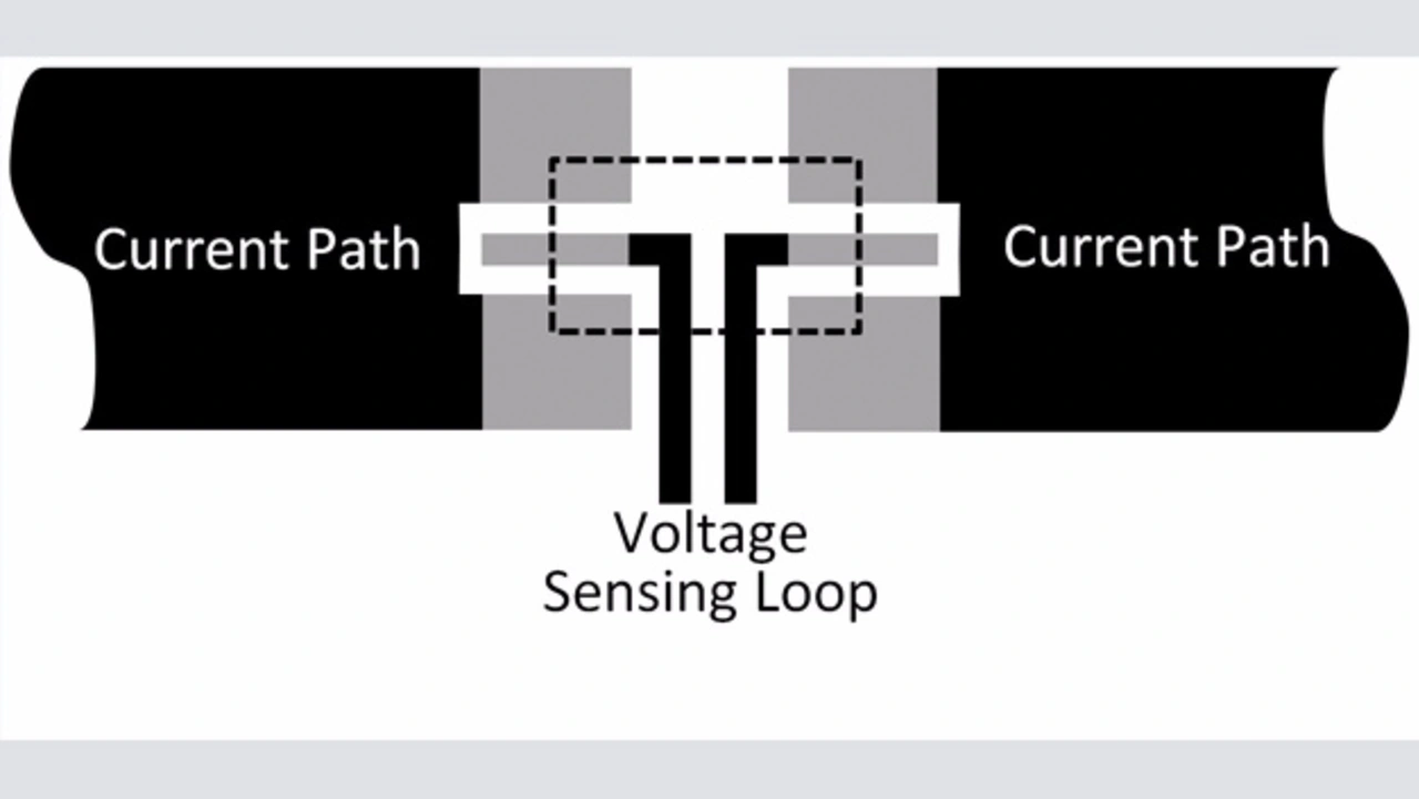Leiterbahnen im Bereich von Shunts richtig zu routen ist allgemein schwieriger als bei normalen Widerständen. Hauptunterschied ist, dass oft vier anstatt zwei Leiterbahnen vorhanden sein müssen, um eine Kelvin-Verbindung zur Vierleitermessung zu bilden – selbst dort, wo nur zwei Anschlüsse vorhanden sind. Ziel ist es, den gemeinsamen leitenden Pfad, den sich Strombahn und Messschleife teilen (Bild 1a, rote Fläche), zu minimieren.