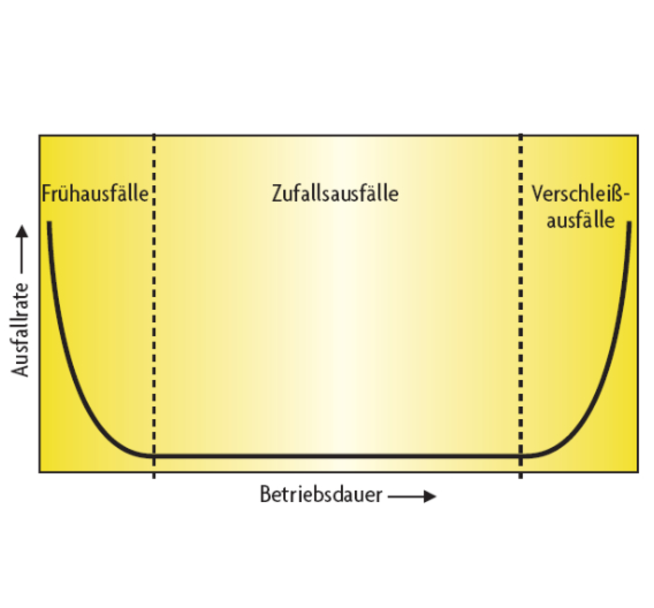 Der typische Verlauf der zeitlichen Entwicklung der Zuverlässigkeit von Elektrolytkondensatoren wird durch die „Badewannenkurve“ charakterisiert [3]. Die Ausfallrate λ (FIT-Rate) gibt die Anzahl von Ausfällen je Zeiteinheit an, die Maßeinheit FIT = „Failures in Time“ bezeichnet die Ausfallwahrscheinlichkeitsdichte in 10–9 Ausfällen/ h. Die Badewannenkurve gemäß Bild 3 hat drei zeitlich aufeinanderfolgende Abschnitte: