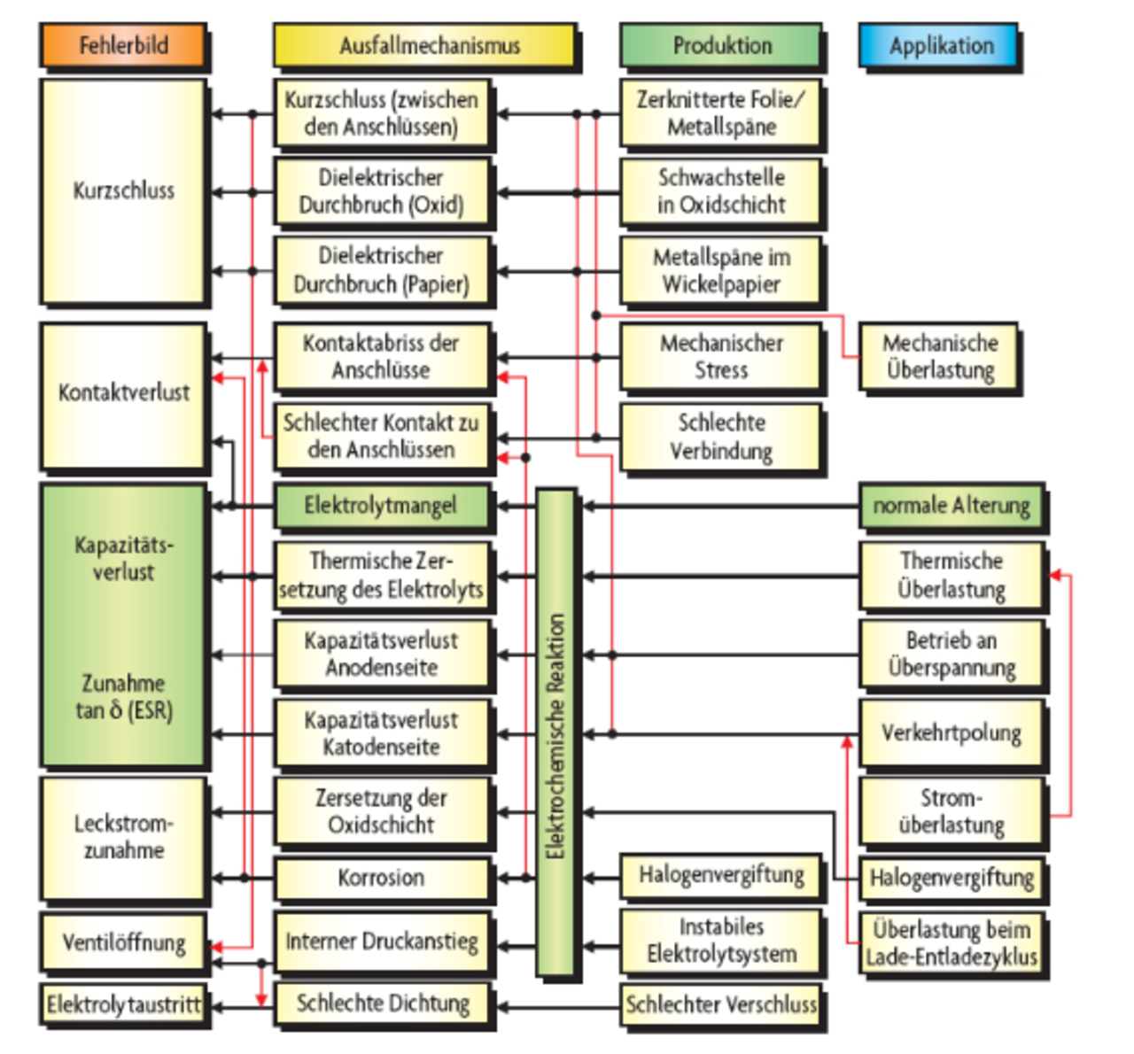 Das übliche Fehlerbild eines normal gealterten Elkos ist ein Änderungsausfall wegen zu geringer Kapazität bzw. eines zu hohen ESR-Wertes (Bild 4, blass grün hinterlegte Felder). Die in der Übersicht dargestellten Ausfallmechanismen können durch produktions- und applikationsbedingte Ursachen ausgelöst werden. In der Praxis sind Beispiele für produktionsbedingte Ausfälle sehr selten, da die Reinheit der verwendeten Materialien und Prozesse sowie die Güte der mechanischen Fertigungseinrichtungen in den letzten Jahren stetig zugenommen haben. Oftmals lassen sich Ausfälle auf eine applikationsbedingte Ursache zurückführen, da nicht in allen Fällen eine Überlastung (Umgebungstemperatur, Ripplestrom, Betriebsspannung, Vibration, Zugbelastung, ...) des Bauteils ausgeschlossen werden kann.
