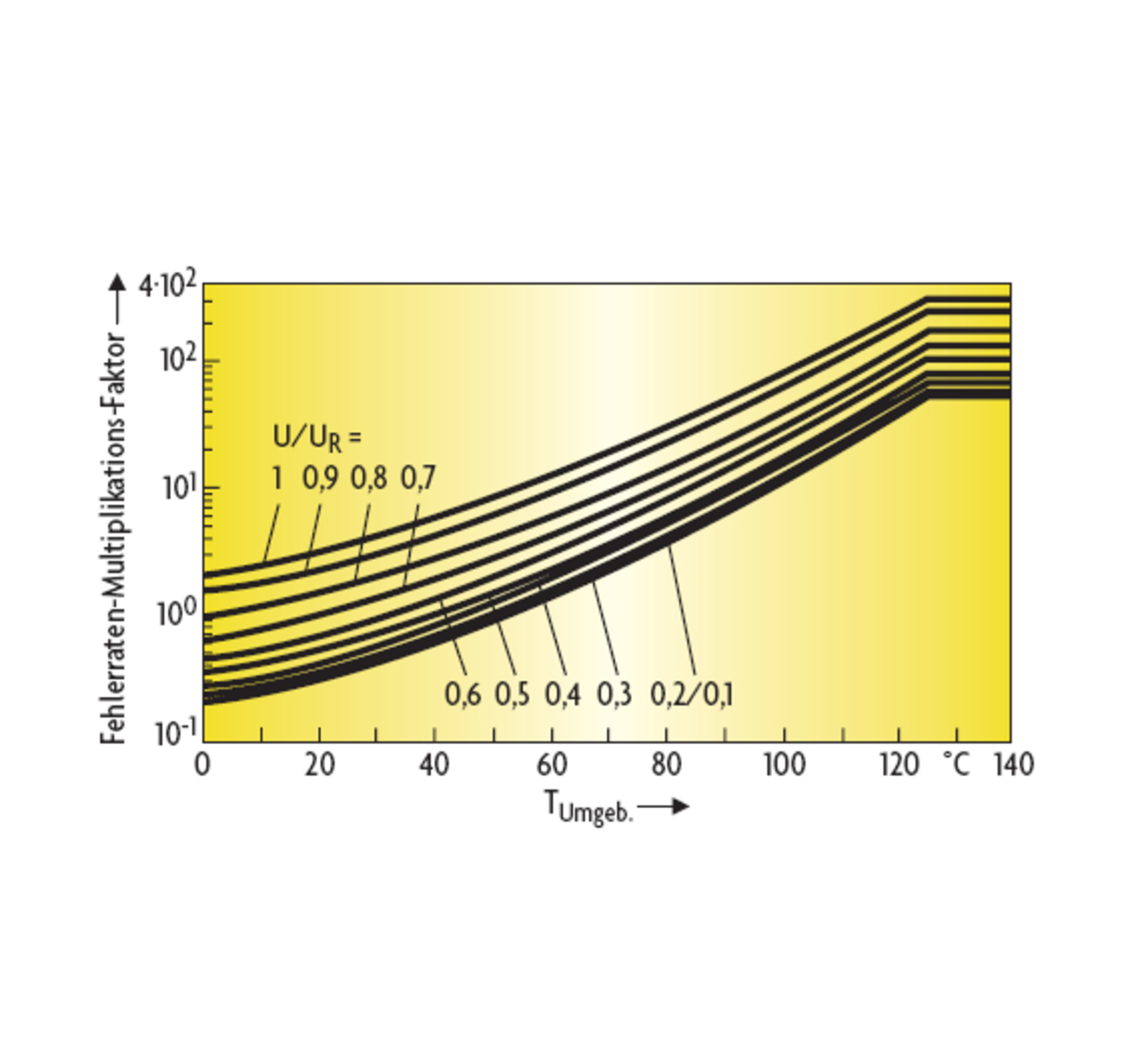 Selbst unter Verwendung der besten Materialien, einer hochwertigen Fertigung und einer effektiven prozessbegleitenden Qualitätssicherung gibt es Zufallsausfälle von Elkos im Feld. Im Zusammenhang mit der Abschätzung von Ausfallraten findet man in der Literatur häufig den Verweis auf MIL-HDBK-217F, das sich auf Zuverlässigkeitsdaten für diverse Bauelemente gründet, die vor mehreren Jahrzehnten erfasst wurden. Die Zahlenwerte der dort genannten Ausfallraten übersteigen die Feld- Ausfallraten der aktuellen Baureihen von Jianghai ca. um einen Faktor 10 bis 100. Die im MILHDBK- 217F genannten Berechnungsvorschriften für Spannungs- und Temperaturkorrekturfaktoren zeigen jedoch qualitativ den Einfluss des Betriebspunktes auf die Zuverlässigkeit an (Bild 5). Als Bezugspunkt gilt hier eine Umgebungstemperatur von 40 °C und ein Betrieb bei halber Nennspannung.