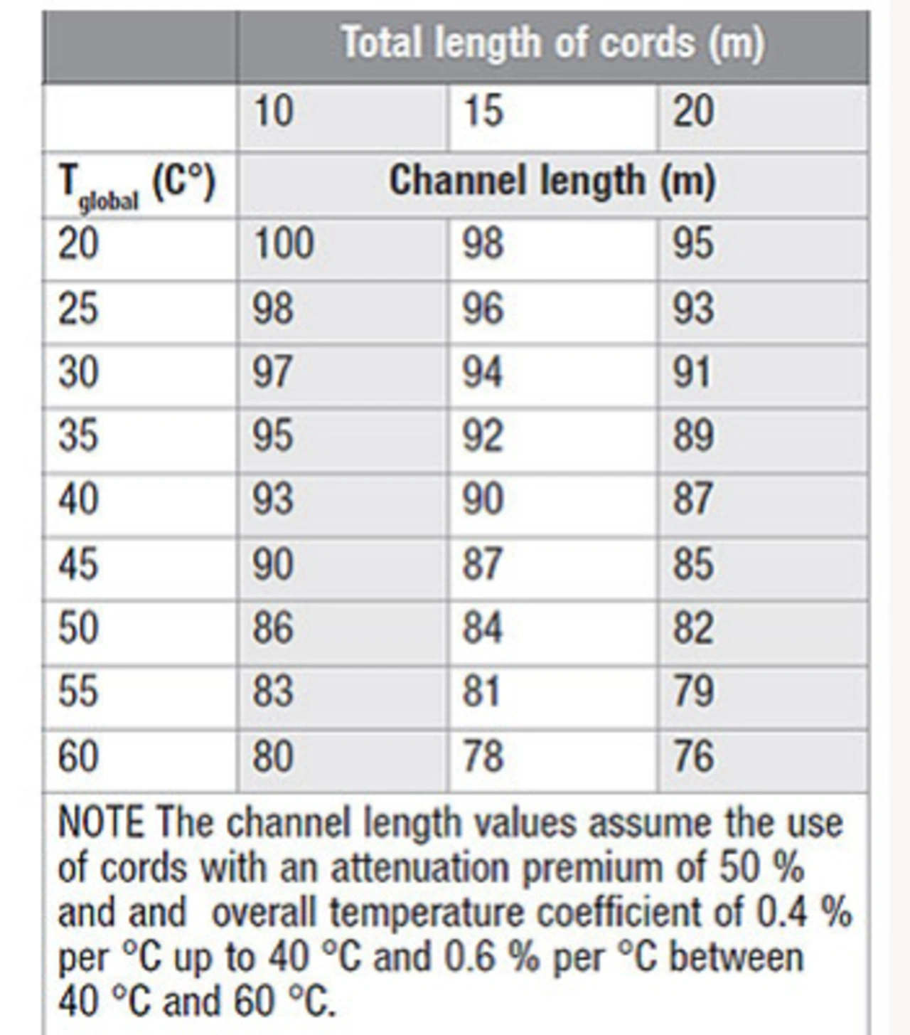 Mit zunehmender Temperatur von 20 °C auf 60 °C kommt es zu einer Verkürzung der Gesamtlänge um bis zu 20 Prozent. Der Aspekt der Verkürzung der Übertragungsstrecke in Abhängigkeit von der Temperatur ist bei der Planung unbedingt zu berücksichtigen. Die Tabelle dient Planern, Ingenieuren und Planern als wertvolle Berechnungsgrundlage. Für Long-Reach-Kabel sind die Längen gemäß der Datenblattgrenzwerte zu berechnen