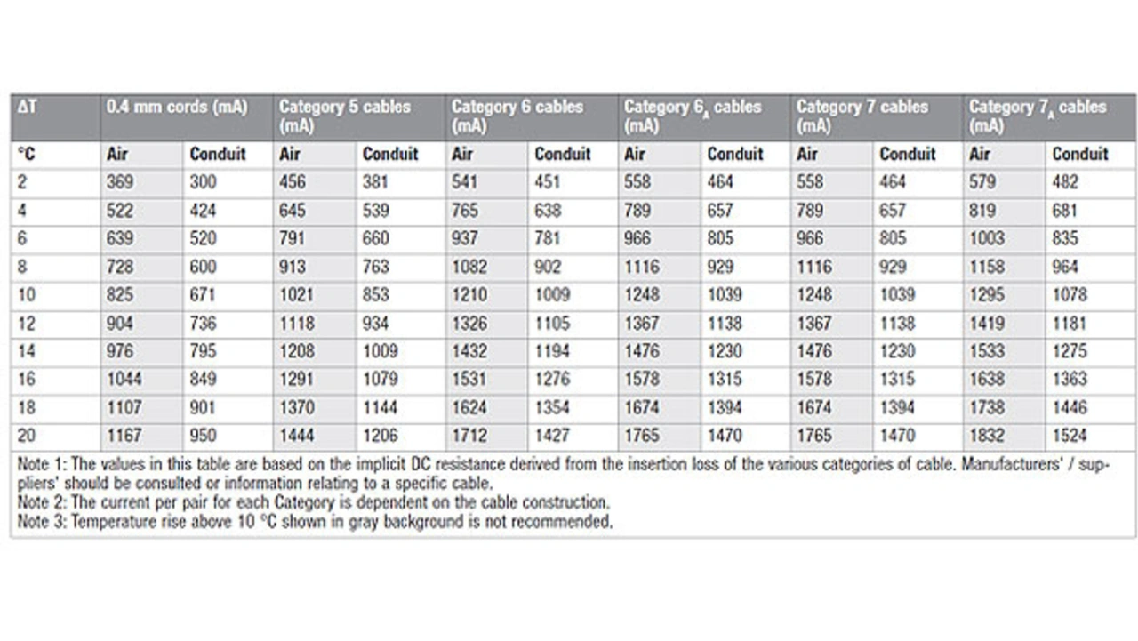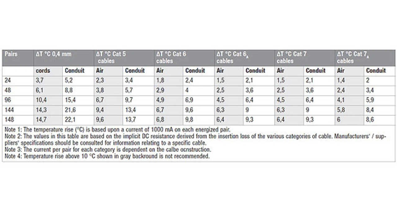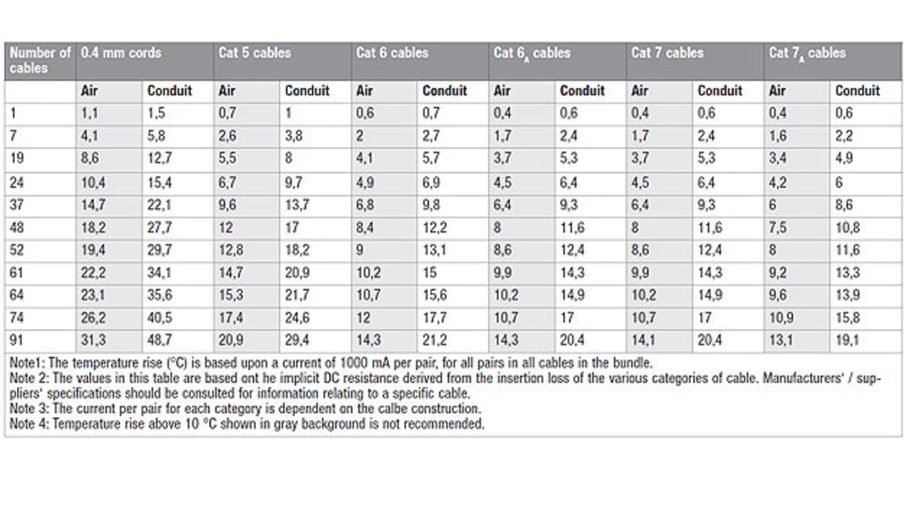 Weitere ISO/IEC-TR-29125-Tests nahmen die Kabelbündelung bei 1000 mA pro Paar unter die Lupe (Tabelle 6). Die Frage war, bei welcher Bündelgröße die Cat.5e- bis Cat.7A-Kabel die Grenze von 10 °C überschreiten. Bei der untersten Kategorie Cat.5e lag die Bündelgröße beim 10-°C-Grenzwert bei 37. Anders beim Cat.7A-Kabel. Dieser Kabeltyp kam bei einem 37-Kabelbündel an offener Luft auf 6,0 °C. Erst bei einem Bündel mit 64 Kabeln erreichen Cat.7A-Kabel den kritischen Wert von 10 °C.