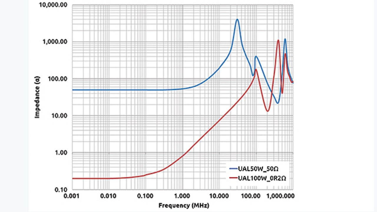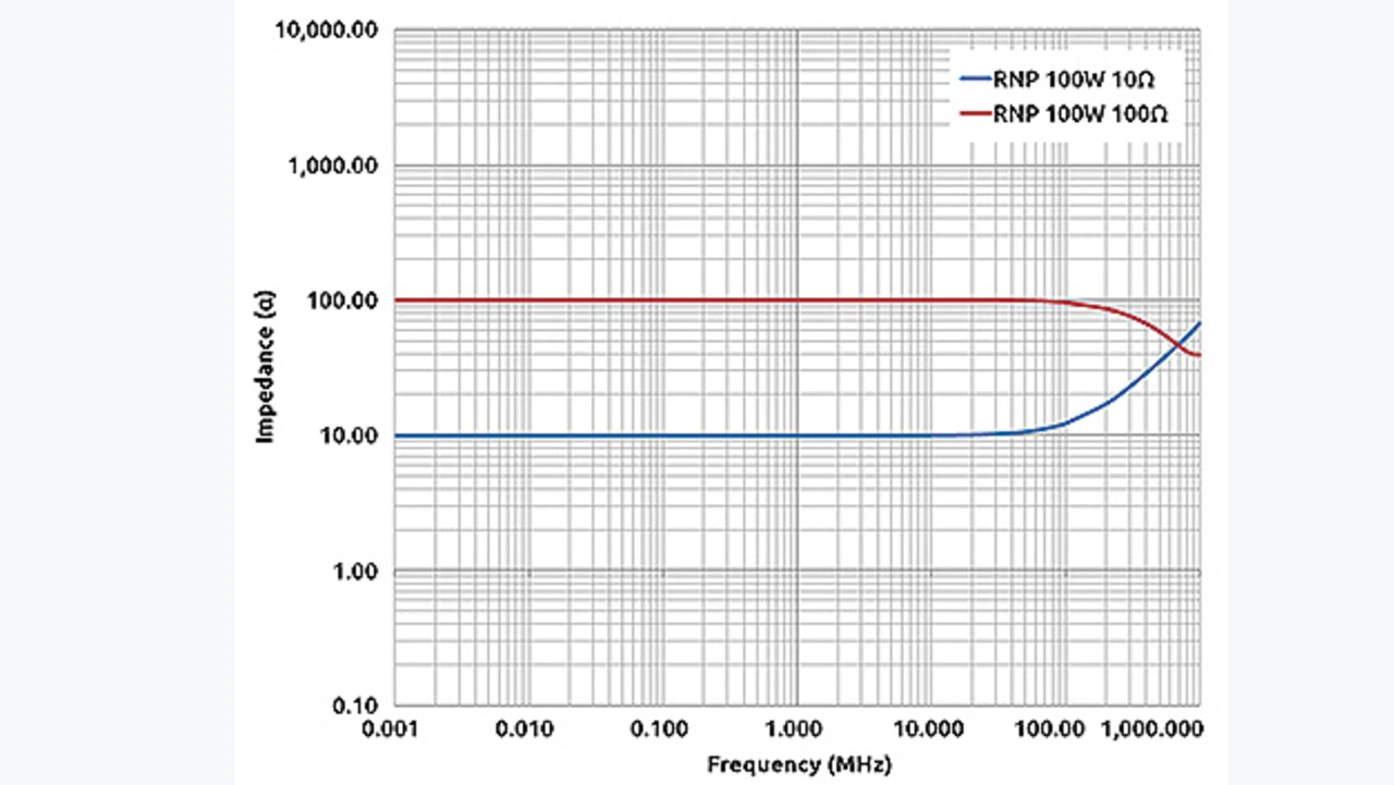 Aus Bild 3 geht hervor, dass der Leistungsfilmwiderstand von 10-100 Ω einen reinen Widerstand von DC bis 100 MHz zeigt, der L-C-R-Resonanzpunkt wird bei 1 GHz oder mehr erreicht. Im Ge- gensatz dazu zeigen drahtgewickelte Widerstände von 10-100 Ω einen reinen Widerstand nur von DC bis 1 MHz, L-C-R- Resonanzpunkte werden ab etwa 10 MHz erzeugt.