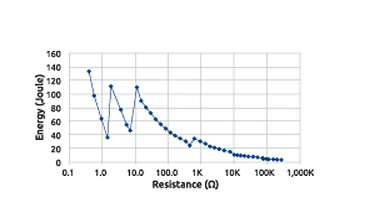 Bei drahtgewickelten Widerständen ist für kurzzeitige Überlastungen mit einer Dauer von 0,1 Sekunden oder weniger die in Bild 4 dargestellte Widerstandsenergiekurve maßgeblich, die in der Regel für jeden Widerstandstyp angegeben wird. Der Widerstandswert ist der ohmsche Wert des Widerstands, die Energie entspricht der angelegten Leistung multipliziert mit der Dauer. Im Fall eines 1-Ω-Widerstands kann somit eine Energie von bis zu 62 Joule auf den Widerstand einwirken. Mit anderen Worten: die Spitzenleistung beträgt 620 W für 0,1 Sekunde, 6.200 W für 0,01 Sekunde, 62 kW für 1 ms. Bei noch kürzeren Pulsen von 1 µs oder 0,1 µs (wie in Bild 5 gezeigt) geht die Funktion als Widerstand in diesem Bereich durch Blindwiderstandskomponenten des Widerstands verloren.