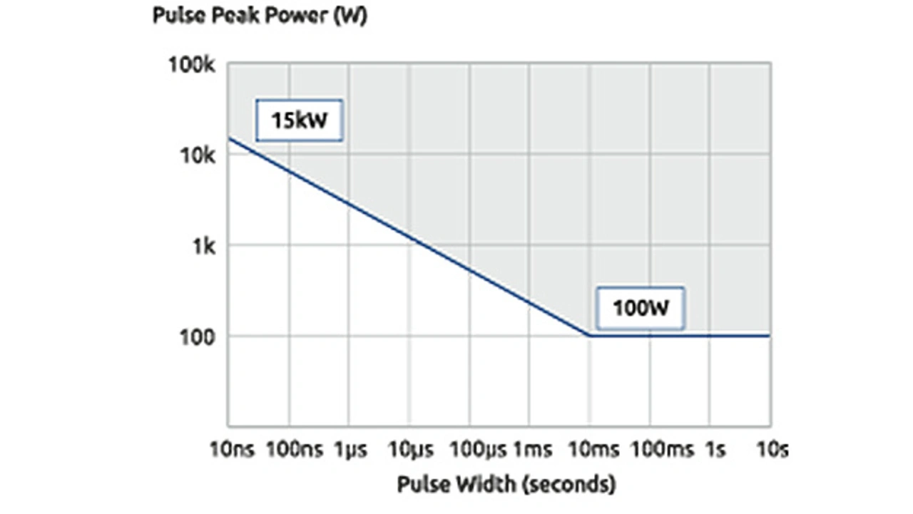 Dabei handelt es sich nicht um eine einmalige Überlast aus dem Kühlzustand, sondern um den Standardbetrieb, wenn die Impulsleistung kontinuierlich mit einem Tastverhältnis von 0,01 angelegt wird. Bei einer Impulsbreite von 1 ms sind nur 200 W zulässig, aber wenn man diese in Energie umwandelt, sind es nur 0,2 Joule (berechnet mittels 200(W) x 0,001(s)).