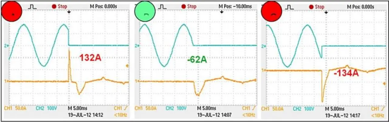 Die Messergebnisse veranschaulichen, dass die kritischsten Einschaltzeitpunkte für die Schaltkontakte in den positiven sowie negativen Spannungsmaxima der Netzversorgung liegen. Die dabei auftretenden Einschaltströme können einen bis zu 600-fachen Wert des Nennstroms (wie im vorliegenden Beispiel I=170 V/500 Ω=0,34 A) annehmen.