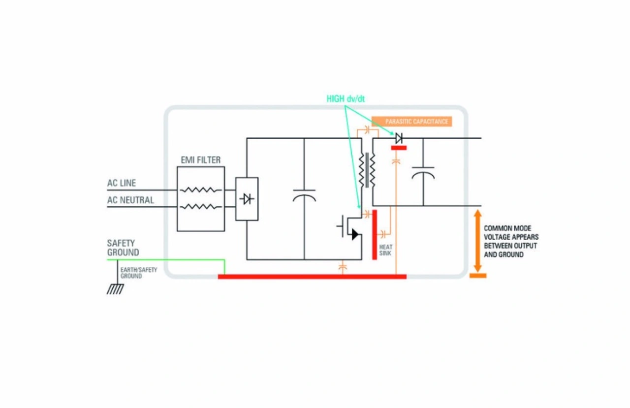 Bild 3 beschreibt die wesentlichen Rauschquellen und -pfade in einem Schaltnetzteil. Das Schalten verursacht abrupte Strom- und Spannungsübergänge. Spannungsflanken (hohes du/dt) koppeln sich über Streukapazitäten ein, Stromflanken (hohes di/dt) über Streuinduktivitäten.