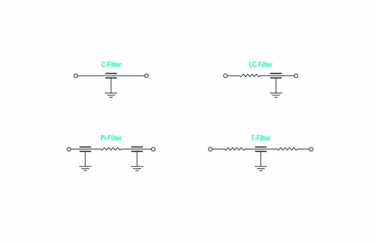 Solche Störsignale können auf verschiedene Weise eingekoppelt werden, etwa über parasitäre Kapazitäten, Kabel oder andere Verbindungen und sie müssen daran gehindert werden, interne Schaltkreise zu stören oder in das Netz zu gelangen. Dieses Ziel – die EMI-Energie zu reduzieren und einzudämmen – wird durch Filter erreicht, die induktive und kapazitive Elemente miteinander kombinieren. Die Art des Filters, dessen Aufbau und Bauteilwerte hängen von den Frequenzen des Störsignals, den Eigenschaften der Störquelle und den Impedanzen der an den Filter angeschlossenen Schaltkreise ab. Bild 4 beschreibt einige gängige Filter – von einem einfachen kapazitiven Filter bis hin zu komplexeren T- und Pi-Filtern. Dabei kommen Durchführungskondensatoren mit drei Anschlüssen zum Einsatz.