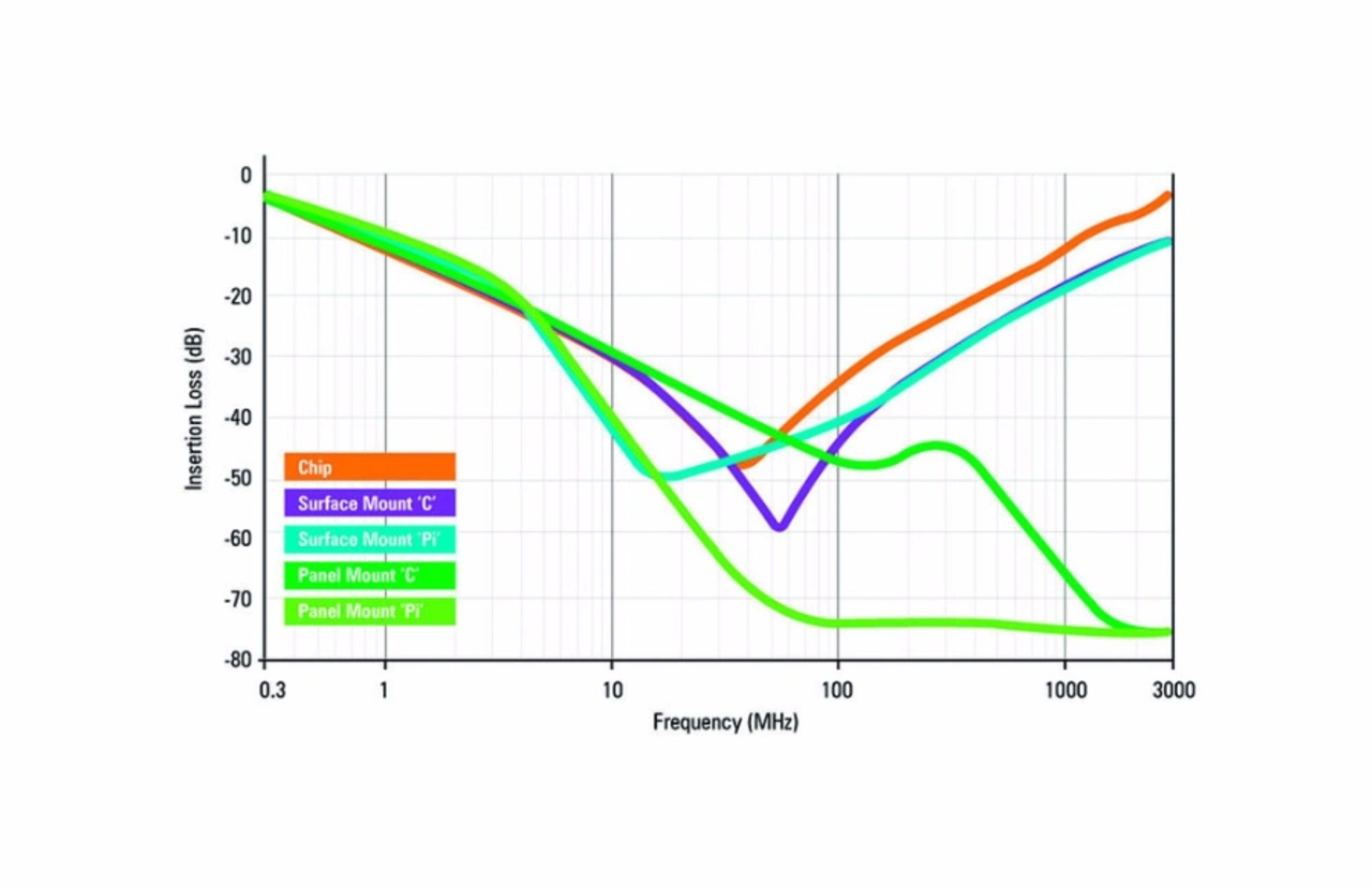 Die zusätzlichen Elemente des Pi-Filters bewirken einen steileren Frequenzgang in Anwendungen, die eine schärfere Frequenzgrenze erfordern. Ein LC-Filter kann zusammen mit einer niederohmigen Quelle und einer hochohmigen Last verwendet werden oder umgekehrt. Das T-Filter ist eine gute Wahl, sind sowohl die Quelle als auch die Last niederohmig. Bild 5 vergleicht den Frequenzgang von C- und Pi-Filtern und zeigt die Auswirkungen der verschiedenen Konfigurationen. Panel- oder Chassis-montierte Filter, die an einer großen metallischen Oberfläche befestigt sind, bieten eine hervorragende Störsignaldämpfung.