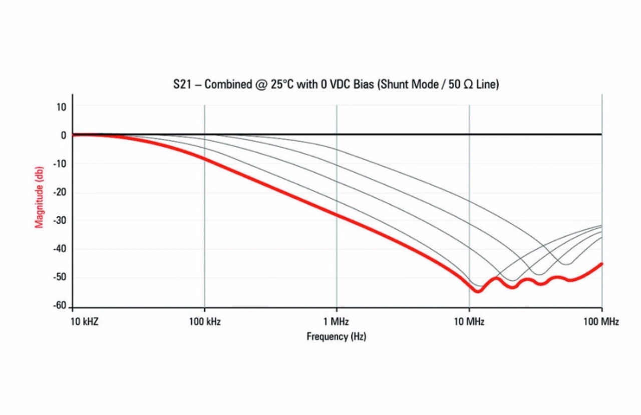Einfacher wird die Entwicklung eines EMV-Filternetzwerks, das Rauschen daran hindert Signale zu stören, wenn sich die Rausch- und Signalfrequenzen stark unterscheiden. Andererseits können Designs mit Induktivitäten und Kondensatoren komplizierter sein, wenn die Frequenzen nahe beieinander liegen. Bild 6 zeigt die Ergebnisse für vier verschiedene Kondensatoren, die mit dem Parameter-Simulationstool »K-SIM« einzeln und in Kombination simuliert wurden. Die einzelnen Diagramme sind grau hinterlegt, um das kombinierte Ergebnis hervorzuheben (rote Linie). Die Simulation macht deutlich, wie die vier Kondensatoren kombiniert werden können, um die Störunterdrückung besser –40 dB über einen breiten Frequenzbereich von 5 MHz bis 100 MHz zu erhalten.