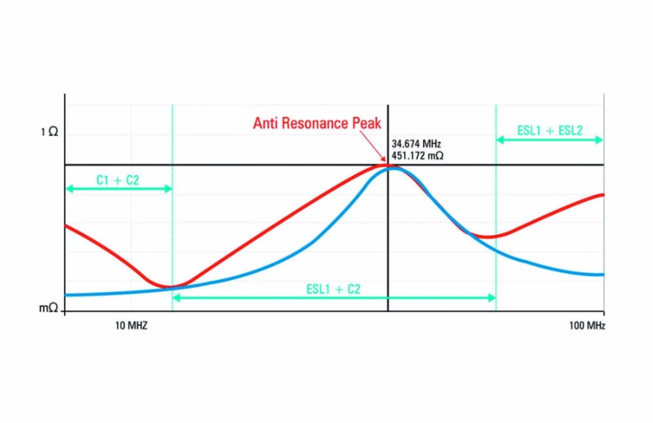 Die Auswahl der parallelen Entkopplungskondensatoren muss sehr sorgfältig erfolgen, da sonst Antiresonanz entstehen kann. Diese verringert die Gesamteffektivität des Entkopplungsfilters. Werden Kondensatoren mit ungleichen Werten und Größen parallel angeordnet, bilden ihre kombinierten kapazitiven und induktiven Blindwiderstände unerwünschte offene LC-Schwingkreise. Diese sind Ursache für Antiresonanz-Artefakte (Bild 7). Ein geringer Abstand zwischen den Kapazitätswerten minimiert diesen Resonanzeffekt.