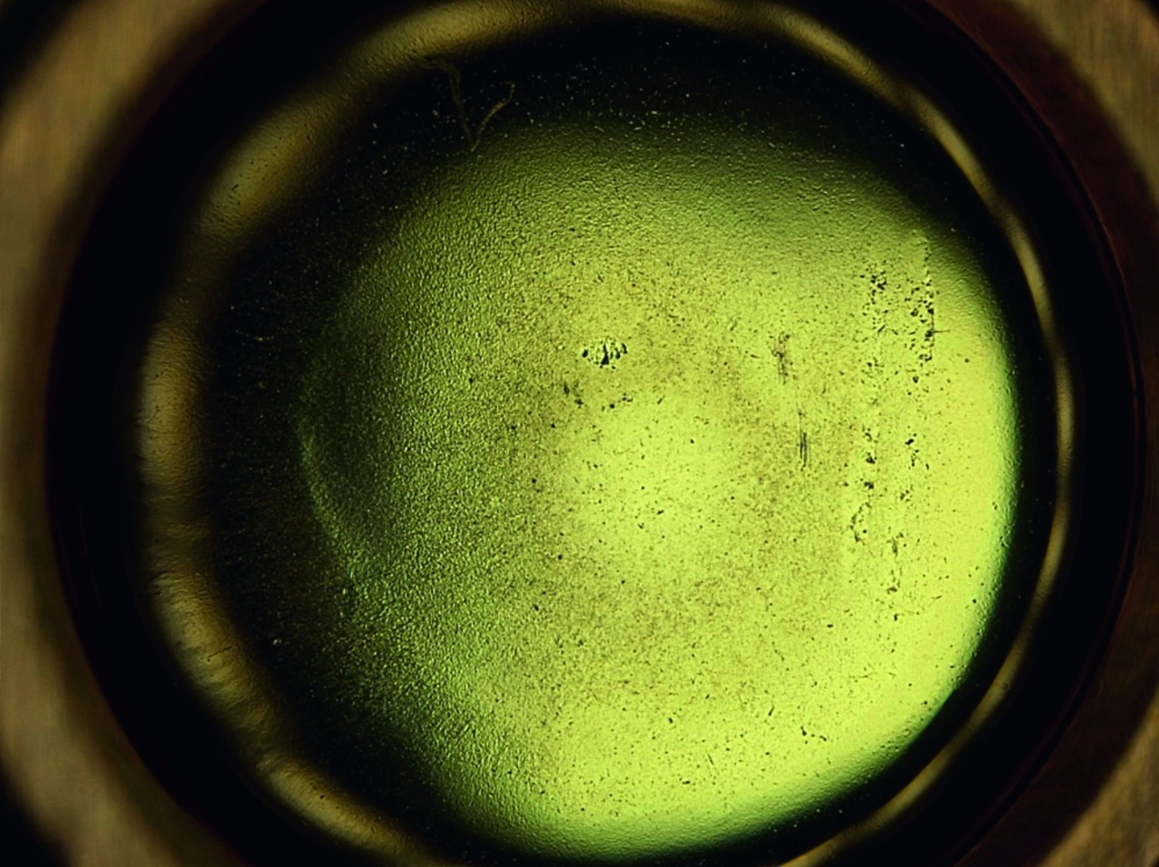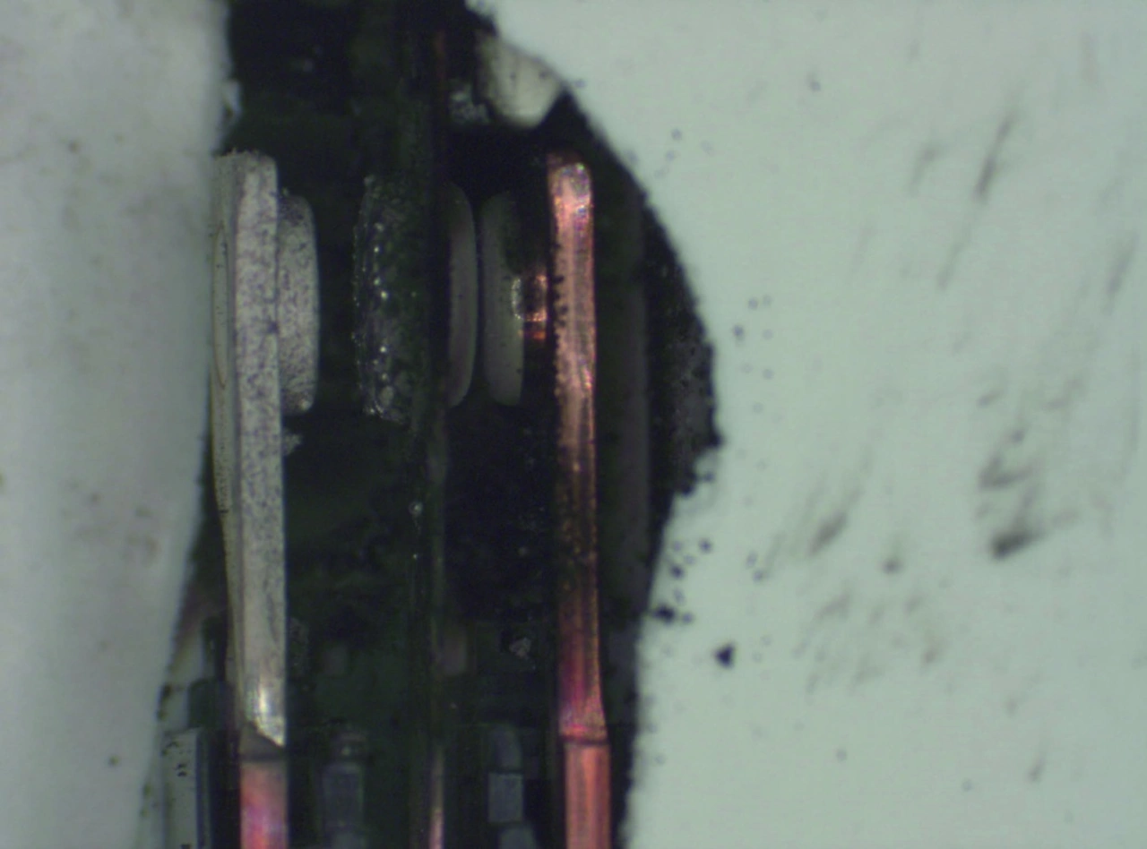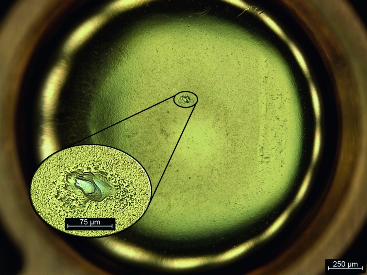 Die erste Analyse nach 5000 Schaltzyklen zeigte bei 36 V/50 mA sowie 48 V/100 mA nur minimale Schaltspuren und eine geschlossene Goldschicht (Bild 2). Deutlichere Schaltspuren nach 5000 Schaltzyklen wies dagegen das Relais bei der Last 125 V/5 mA auf, hier schimmerte an einer kleinen Stelle bereits die Silberlegierung des Kontaktes durch, wie Bild 3 zeigt.