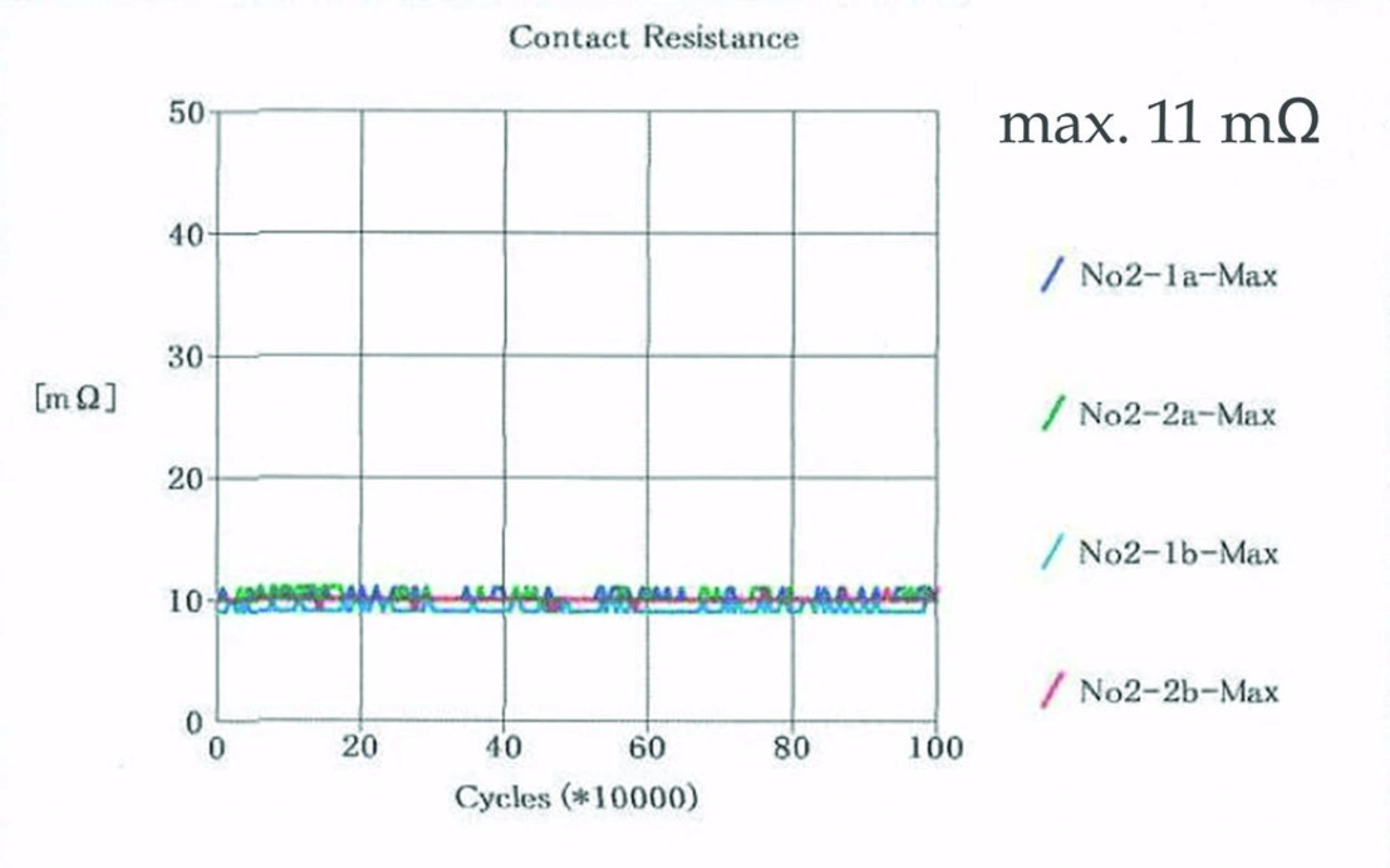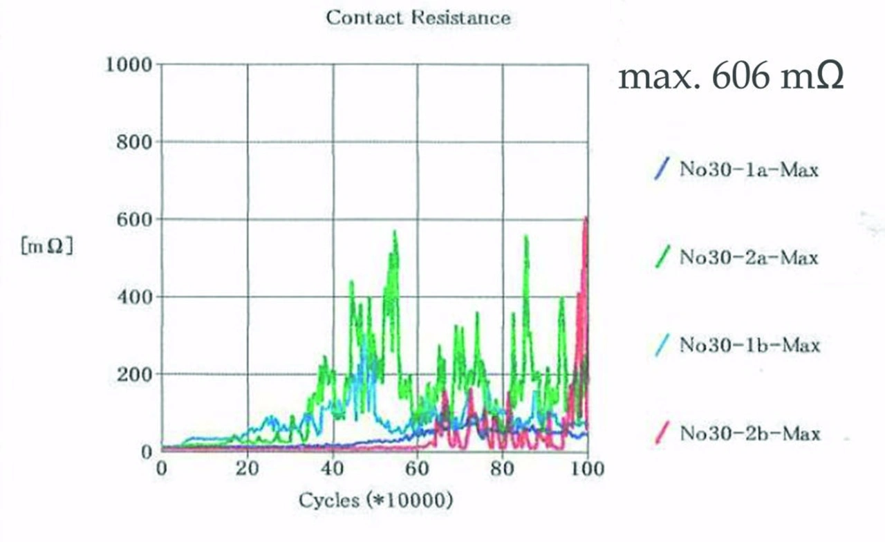 Kontaktwiderstand von Standard- und Goldkontakten über die Lebensdauer Um den Einfluss von Goldkontakten auf den Kontaktwiderstand in der Praxis zu testen, unterzog Panasonic das Relais SF4D einem Lebensdauertest über 1 Million Schaltspiele bei einer Umgebungstemperatur von +60 °C und einer Last von 5 V/1 mA. Die Messung des Kontaktwiderstands fand alle tausend Schaltspiele statt. Verglichen wurde Goldschichtdicken von 0,5 µm und 3,0 µm. Zu Beginn des Tests lagen die Kontaktwiderstandswerte beider Typen um die 10 mΩ. Die Goldkontakte zeigten während des Tests einen sehr stabilen Kontaktwiderstand (Bild unten links), der nach 1 Million Schaltspielen im Schnitt bei 9,1 mΩ lag, mit Minimal-/Maximalwerten von 5,6 mΩ bis 13,4 mΩ. Deutlich inkonsistenter verhielten sich dagegen die Standardkontakte (Bild unten rechts). Zwar kann der Durchschnittswert von 26,5 mΩ überzeugen, es gab aber auch Ausreißer mit deutlich über 1 Ω. Ob dies in der Praxisanwendung wirklich kritisch oder ausschlaggebend ist, muss von Fall zu Fall entschieden werden. |