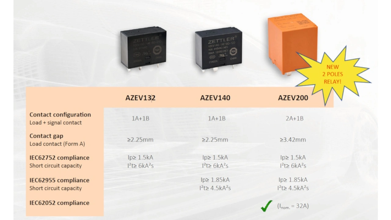 Einer der ersten Relais-Hersteller am Markt, die sich stark auf die Elektromobilität fokussiert haben, war Zettler Electronics. Das Unternehmen bedient diesen Markt schon seit Jahren, sodass die Elektromobilität heute neben der Photovoltaik zu den Kernmärkten des Unternehmens gehört. Zu den wichtigsten Produkten aus dem Zettler-Relais-Programm gehört aktuell das Relais AZEV200, ein zweipoliges 40-A-Relais mit Überwachungskontakt und großem Kontaktabstand von ≥ 3,42 mm, welches mit seiner speziellen Kontaktsatzanordnung darauf ausgelegt ist, extremen Kurzschlussströmen ohne Verschweißen der Kontakte standzuhalten. Das Relais erfüllt laut Angaben von Zettler alle Normen hinsichtlich Kurzschlussfestigkeit, die es derzeit im Bereich EV-Charging gibt.