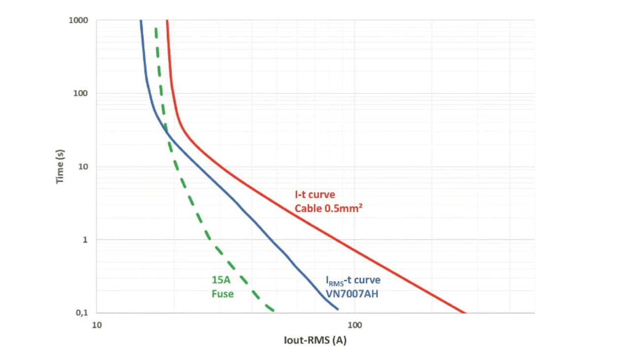 Bei dieser Darstellungsart lassen sich die Strom-Zeit-Charakteristika von Sicherungen und Kabeln einfach vergleichen. Für das zu schützende Kabel muss dessen Kurve rechts von der Sicherung und des VN7007AH liegen, damit die Kabelisolierung bei einem bestimmten Bemessungsstrom nicht beschädigt wird. Aus diesem Vergleich in Bild 3 kann man entnehmen, wie gut das 0,5 mm² dicke Kabel, die 15-A-Schmelzsicherung und das VN7007AH aufeinander abgestimmt sind. Bei Überlast oder Kurzschluss kann das VN7007AH das Kabel jederzeit schützen, da dessen Reaktionszeit immer kürzer ist als die Zeit, in der das Kabel beschädigt wird.