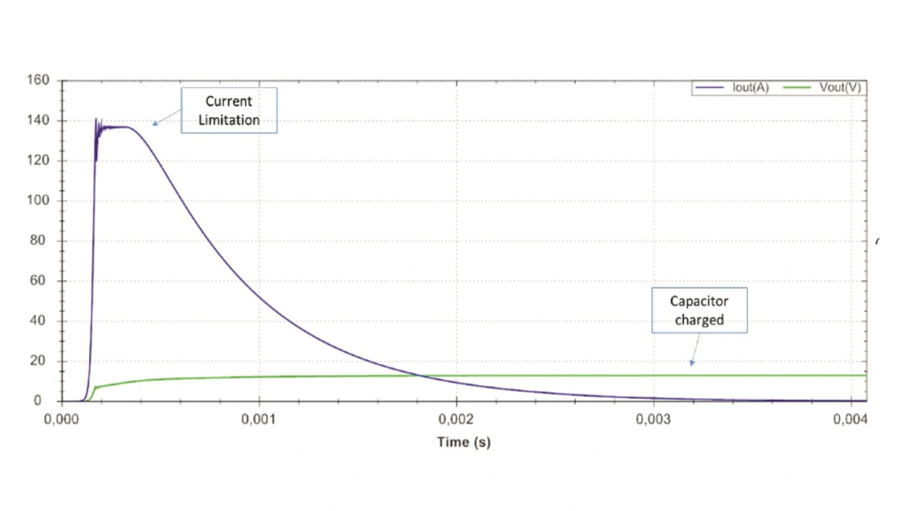 Im Beispiel in Bild 4 wird das VN7004CH verwendet, um einen 9-mF-Kondensator bei 13,5 V mit einer Gesamtimpedanz am Ausgang von 50 mΩ (einschließlich des ESR des Kondensators) zu laden. Die Kurven in Bild 4 zeigen, wie die Strombegrenzung beim Einschalten eingreift. Es fließen weniger als 140 A für weniger als 200 µs, und der Kondensator ist in weniger als 3,5 ms vollständig geladen.