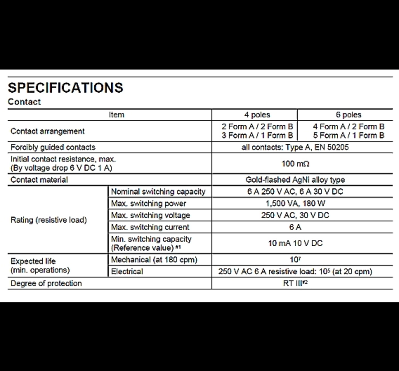 Das Bild zeigt exemplarisch einen Auszug des Datenblatts des SF-Y Relais. Mit einem nominellen maximalen Schaltvermögen von 6 A bei 250 V(AC)/30 V(DC) und einem minimalen Schaltvermögen von 10 mA/10 V(DC) reiht es sich nahtlos in die üblichen Dimensionen vergleichbarer Typen ein. Leider geben diese gängigen Werte aber kaum Aufschluss über die tatsächlichen Fähigkeiten des Relais. Sie stellen nur eine Momentaufnahme dar, die nichts anderes aussagt, als dass der Hersteller eine Lebensdauer von 100.000 Schaltspielen bei einer ohmschen Last von 6 A bei 250 V(AC)/30 V(DC) und Betriebsbedingungen laut Datenblatt garantiert.