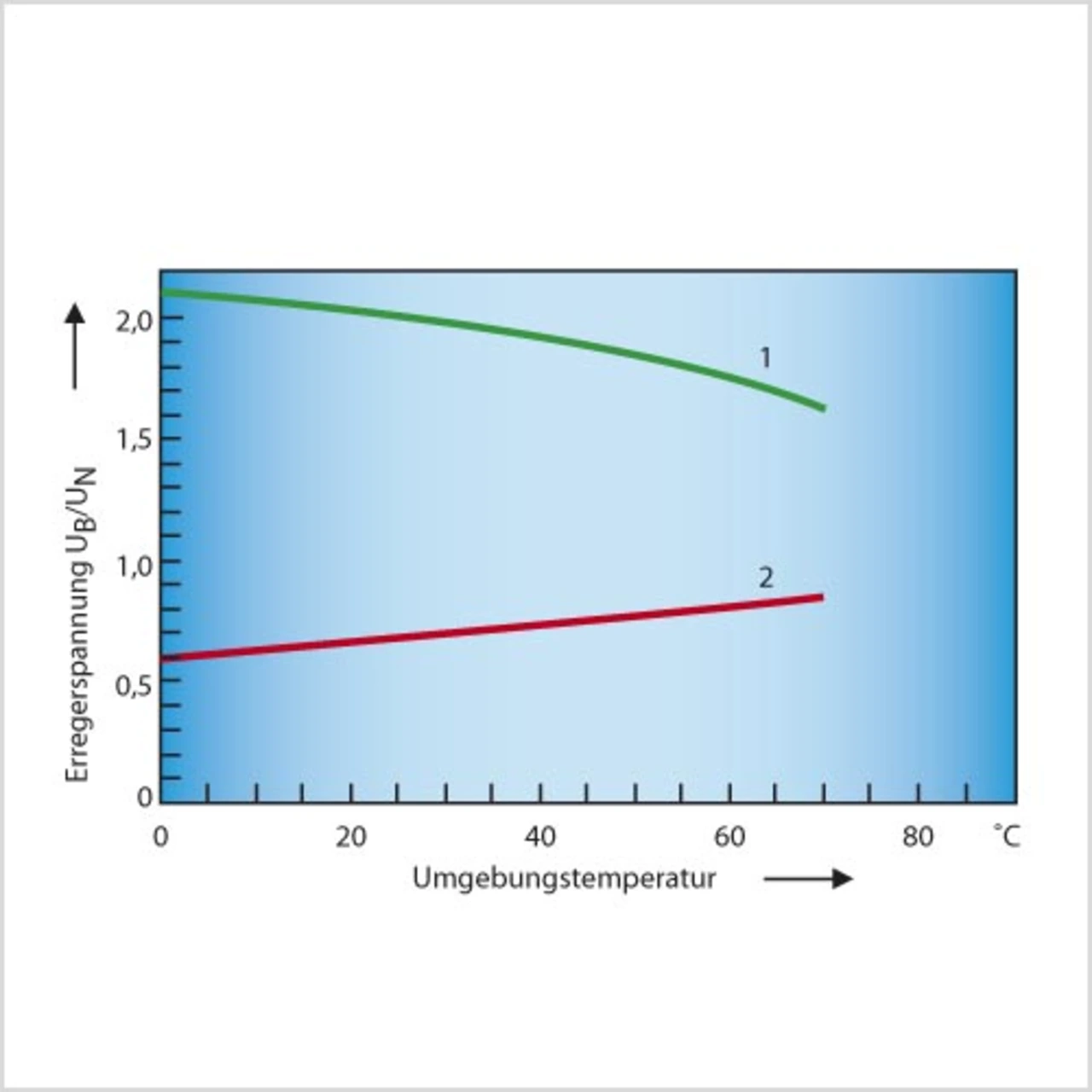 Voraussetzung für die Absenkung der Erregerspannung ist, dass alle funktionalen Parameter wie Vibrations- und Schockfestigkeit erhalten bleiben. Dies sollte bei modernen Relaiskonstruktionen auch nach Absenkung der Erregerspannung gewährleistet sein. Hinzu kommt noch die Betrachtung der Temperaturbereiche (Umgebungstemperatur), in denen das Relais arbeiten soll, und Schwankungen in der Spulenerregerspannung (Bild 1). Im Ergebnis beträgt die zu erzielende Halteleistung rund ein Drittel der Erregerleistung.